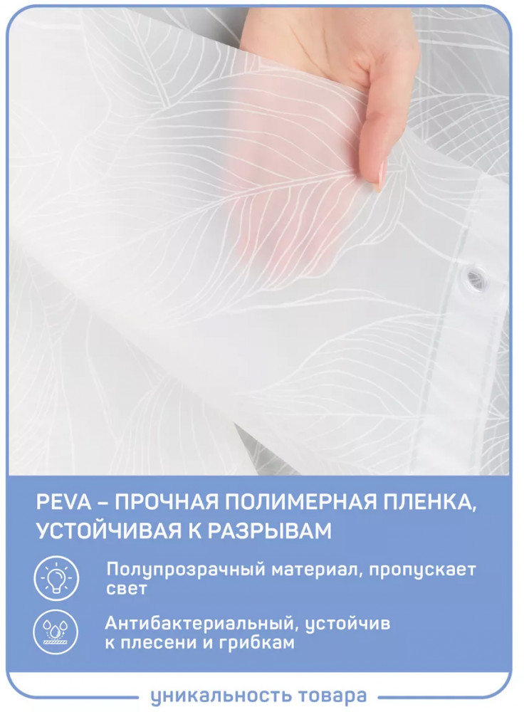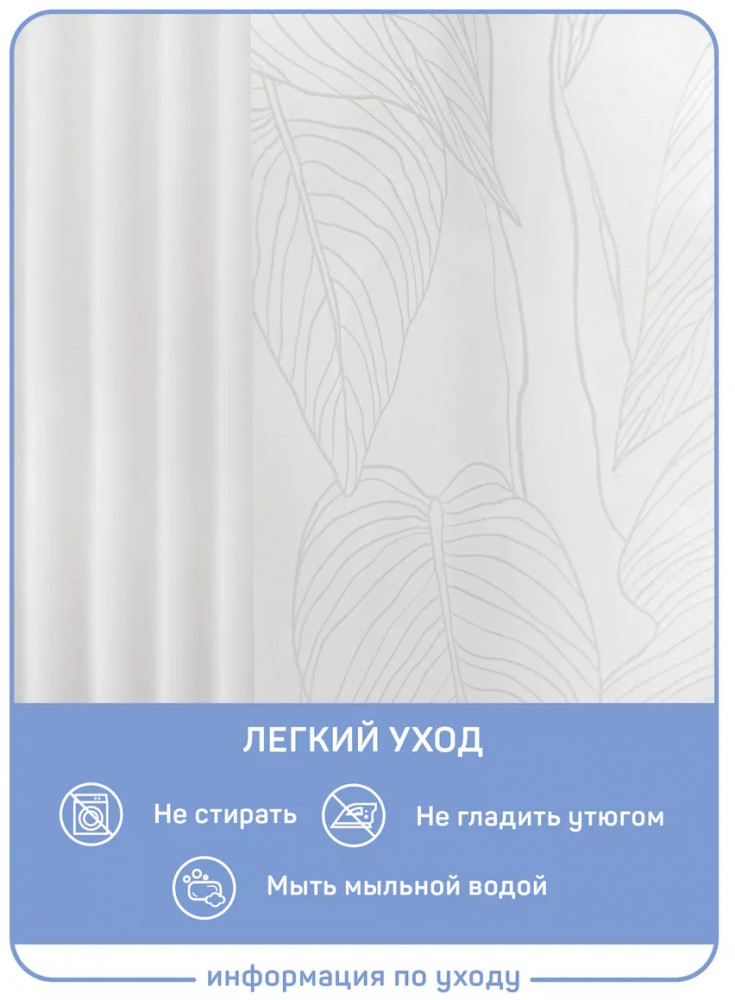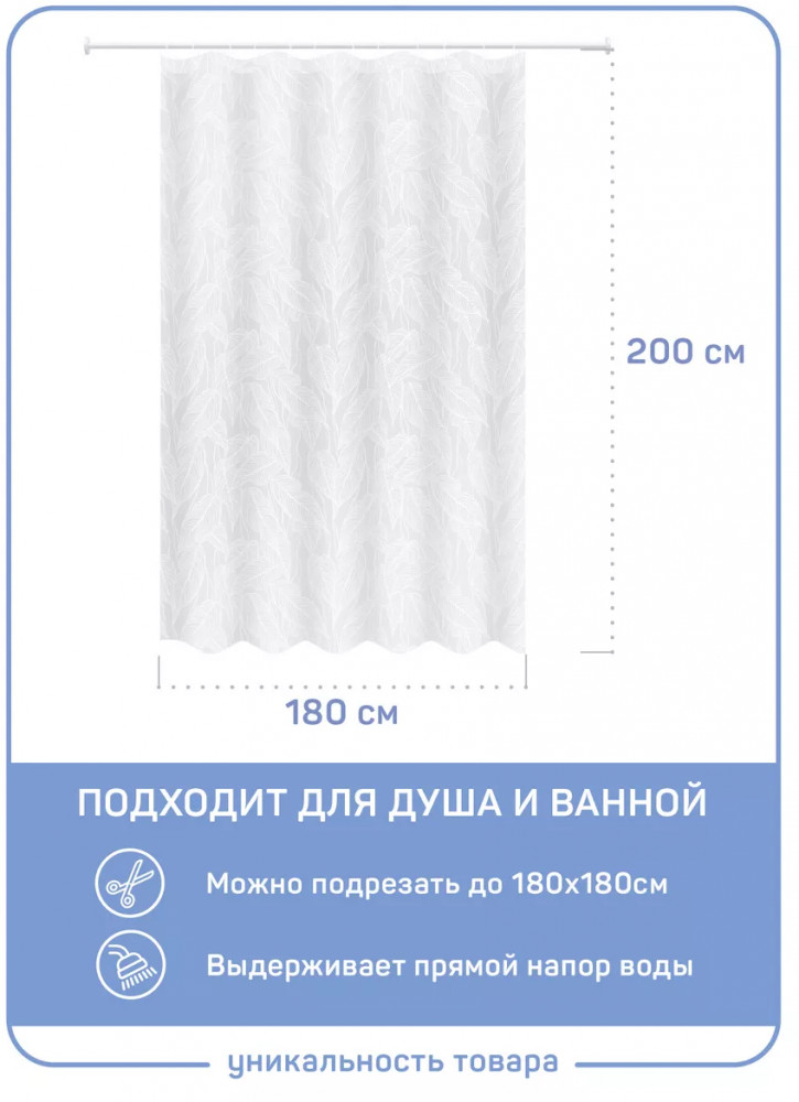 💳 Оплатить за товар можно при получении 🇰🇿 Есть бесплатная доставка по Казахстану от 1 дня 🎁 Копите бонусы с каждой покупки Штора для ванной комнаты, материал PEVA, размером 180×200 см (Увеличенная высота 200 см и ширина 180 см). Водонепроницаемая и водоотталкивающая. Прозрачная фурнитура — кольца и люверсы. Не ржавеют. Полупрозрачная пленка с нанесенным белым рисунком листьев пропускает свет в ванну и смотрится легко в самом маленьком помещении, не стоит колом. Безопасна для здоровья, не плесневеет, легко моется мыльным раствором. Можно подрезать под любой размер. PEVA — прочная виниловая пленка (как клеенка, но лучше), позволяющая наносить любые принты и устойчивая к разрыву. Пластиковая занавеска пропускает в душ свет, но не показывает лишнего. Защищена от плесени и грибка. Не содержат ПВХ и хлора, не пахнет, не выделяет токсичных веществ под воздействием пара и высоких температур. Занавес максимально износостойкий и очень прочный. Надежно защищает от прямого напора воды и брызг. Антигрибковое покрытие делают декор для ванной долговечным. Занавески для душа полностью непромокаемая, защищает от потоков воды любой силы. Разглаживается от горячей воды и пара. Прозрачные люверсы и кольца из пластика не выделяются. Занавеска для ванной служит надежной перегородкой от брызг в ванной комнате, душе. |