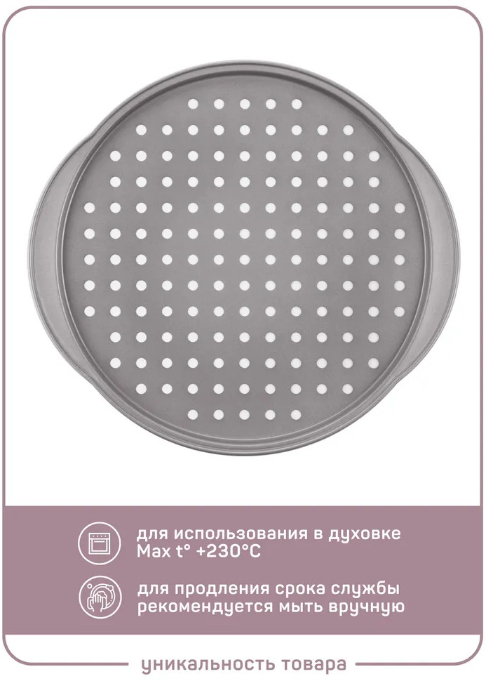 💳 Оплатить за товар можно при получении 🇰🇿 Есть бесплатная доставка по Казахстану 🎁 Копите бонусы с каждой покупки Форма для выпечки и запекания. Идеальна для приготовления пиццы. Равномерный прогрев изделия. Антипригарное покрытие Goldflon. Внешнее и внутреннее антипригарное покрытие для легкого ухода. Можно мыть в посудомоечной машине. Для использования в духовке (max t° +230°C). |