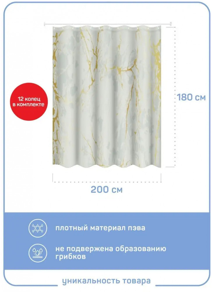 Тканевая серая шторка для ванной с принтом под мрамор с оливковым тоном 200×180см (увеличенная ширина 200, 180 высота). Прозрачные люверсы и 12 колец в комплекте — пластиковая фурнитура не ржавеет и не портит шторку. Полиэстер — полимерный материал со структурой плетения. Его можно стирать в стиральной машине и гладить при низких температурах. У аксессуара есть утяжелитель. Шире, чем занавески 180×180, поэтому подходит для большего количества помещений. Оптимальный размер водоотталкивающего и водонепроницаемого текстильного барьера, отдаляющего зону душа от общей площади комнаты. Не токсична, с пропиткой от плесени, делает ванную сухой, чистой и нарядной. Занавес держит форму, не липнет, красиво ложится складками или струится ровным полотном. Ткань шторы в ванную плотная по плетению. Декор акцентный — мрамор приглушенного зеленого тона (оливковый или фисташка) с рисунком прожилок впишется в однотонный интерьер.Прозрачные кольца и люверсы ширмы не оттягивают на себя внимание и вписываются в любой интерьер, не ржавеют и не портят материал. |