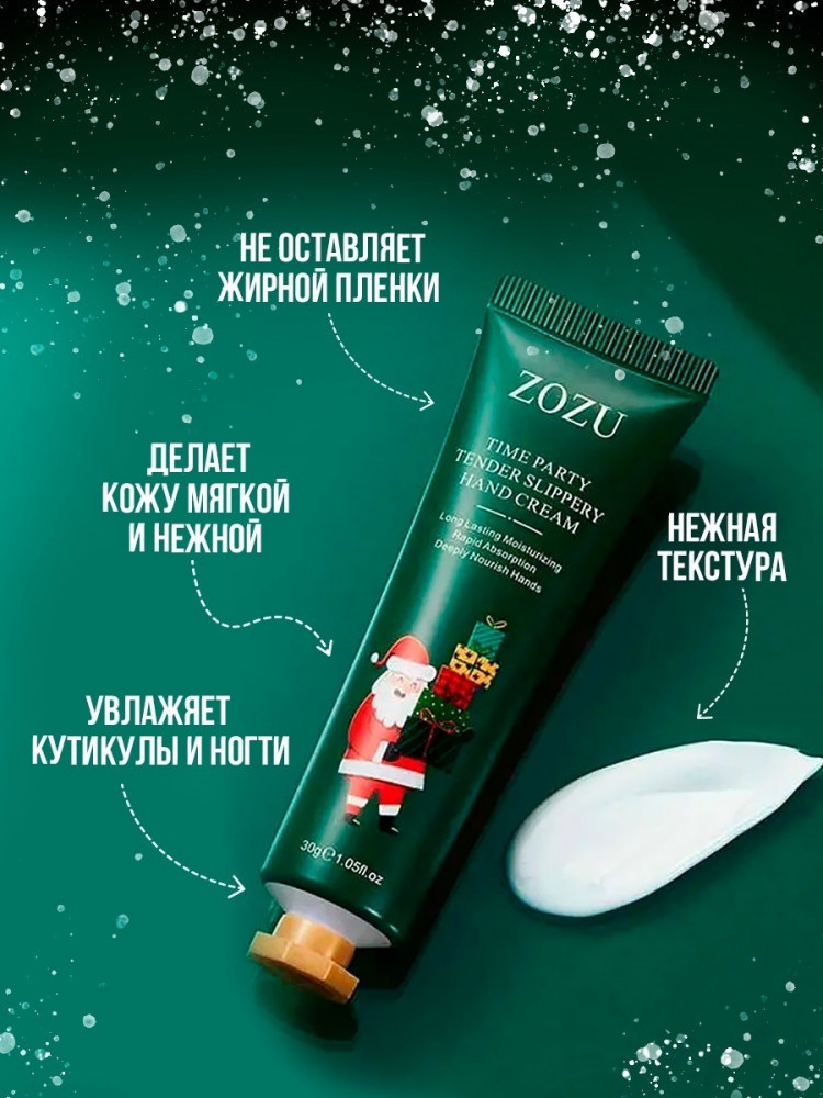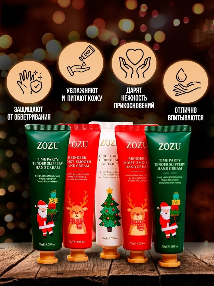 ZOZU Christmas 5 в 1 — новогодний подарочный набор кремов для рук, разработанный для зимнего ухода, увлажнения, питания и антивозрастной заботы. В комплект входят увлажняющий крем против сухости, два ночных восстановительных крема и два разглаживающих крема от морщин, которые глубоко питают сухую и огрубевшую кожу, стимулируют упругость, улучшают текстуру и помогают защитить руки от холода и ветра. Ночные формулы насыщают кожу микроэлементами и витаминами, ускоряют регенерацию и восстанавливают мягкость после сна, дневные легко впитываются, не оставляют жирной плёнки и создают невидимый барьер против пересушивания. Разглаживающие кремы содержат компоненты для повышения эластичности и стимулирования выработки коллагена, что сокращает видимость мелких морщин на тыльной поверхности рук.