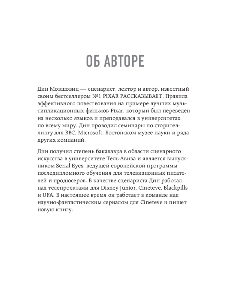 💳 Оплатить за товар можно при получении 🇰🇿 Есть бесплатная доставка по Казахстану от 1 дня 🎁 Копите бонусы с каждой покупки Серия: Пиши и сочиняй. Книги по сценарному и писательскому мастерству Бестселлер Амазона! 10 глав — 10 советов, каждый из которых аргументируется на основе уже существующих анимационных фильмов компании. Будет интересна начинающим писателям и сценаристам, которые хотят научиться рассказывать истории, а также поклонникам мультфильмов Pixar, которым интересно узнать больше о создании их любимых историй. В обновленном дополненном издании автор книги добавил разбор новинок студии, таких как «История игрушек 4», «Вперед», «Душа», «Базз Лайтер» и «Элементарно»! |