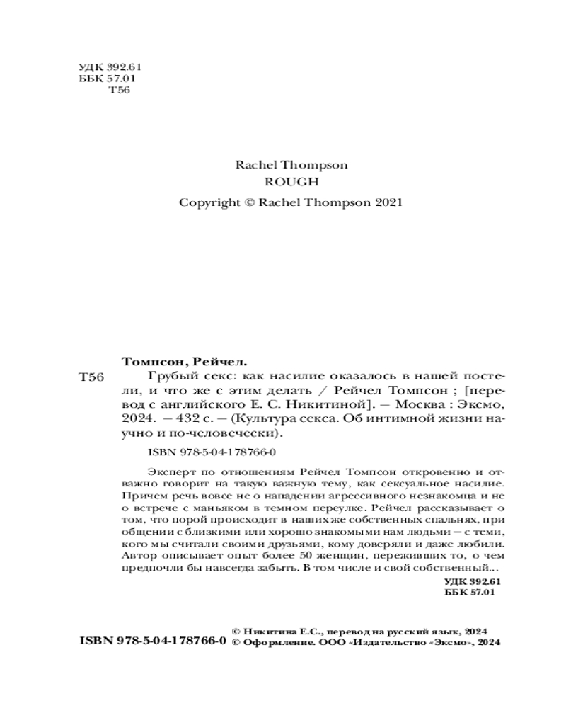 Серия: Культура секса. Об интимной жизни научно и по-человечески Рейчел Томпсон — ведущий репортер британского издания Mashable, пишущий об отношениях и сексе. Едва увидев свет, «Грубый секс» вызвал тысячи отзывов, а почту автора парализовало от огромного количества писем, основным лейтмотивом которых были слова читательниц: «Это должна прочитать каждая из нас!»