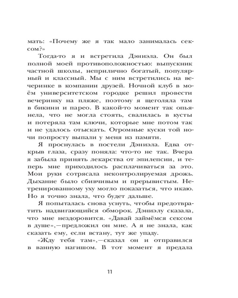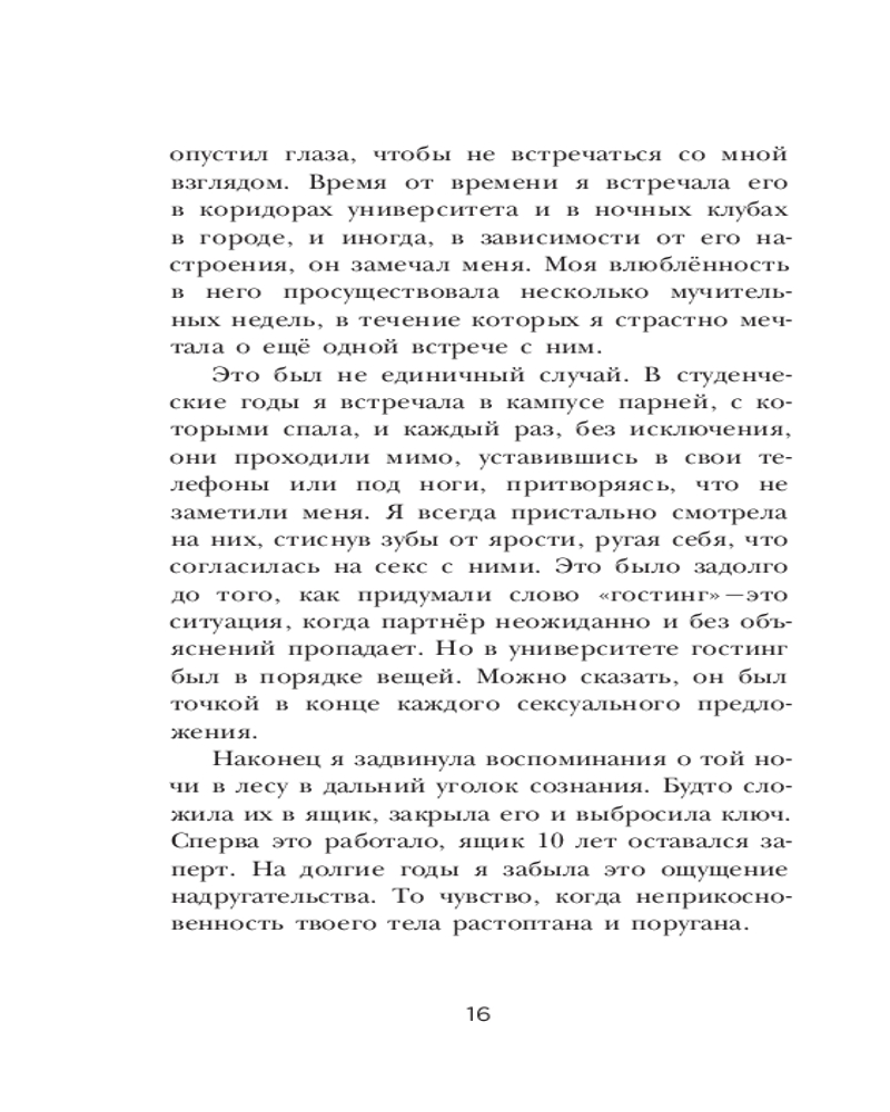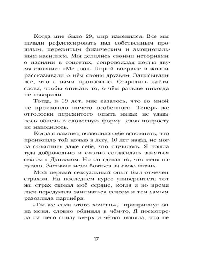Автор откровенно и отважно говорит на такую важную тему, как сексуальное насилие. Причем, речь вовсе не о нападении агрессивного незнакомца и не о встрече с маньяком в темном переулке. Рейчел рассказывает о том, что порой происходит в наших же собственных спальнях, при общении с близкими или хорошо знакомыми нам людьми — с теми, кого мы считали своими друзьями, кому доверяли и даже любили. Автор описывает опыт более пятидесяти женщин, переживших то, о чем предпочли бы навсегда забыть. В том числе, и свой собственный...