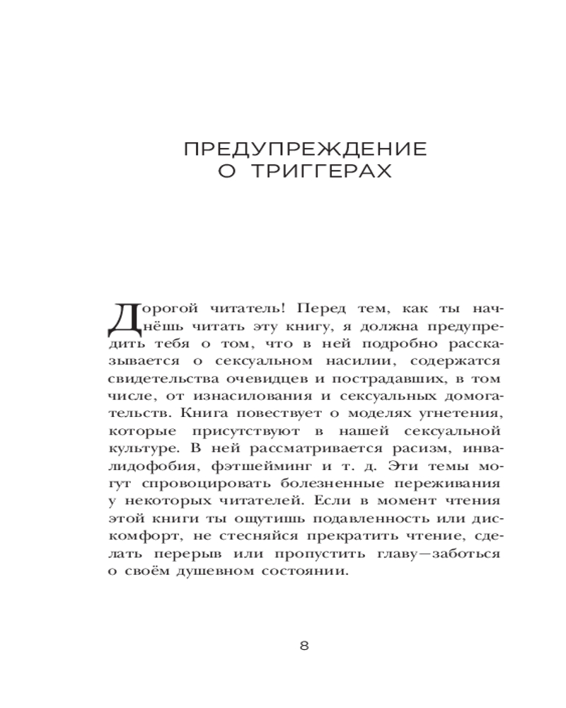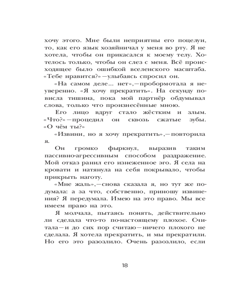 Книга помогает женщине осознать свои границы ДО того, как они были грубо нарушены. И представляет собой руководство для тех, кто хотя бы единожды испытывал во время секса что-то, что заставило их чувствовать себя незащищенными или напуганными. |