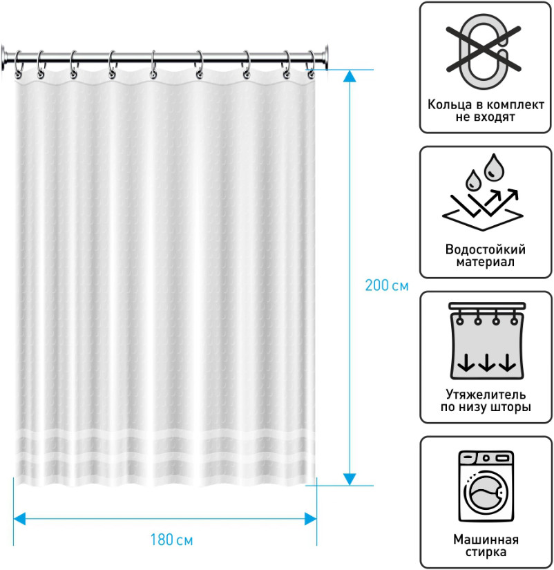 💳 Оплатить за товар можно при получении 🇰🇿 Есть бесплатная доставка по Казахстану от 1 дня 🎁 Копите бонусы с каждой покупки Штора для ванной — незаменимый и практичный аксессуар современной ванной. Шторы предотвращают попадание брызг воды, мыльной пены на пол и стены ванной комнаты. Штора для ванной имеет металлические люверсы (12 шт), которые защищают шторы от случайного разрыва в местах навешивания. Нижний край имеет утяжелитель. Пластиковые кольца не входят в комплект. Штора выполнена из водонепроницаемого материала — полиэстер. Он плотный, прочный, обладает водоотталкивающими свойствами, идеально подойдет для ванны, рисунок не выцветает и не тускнеет. |