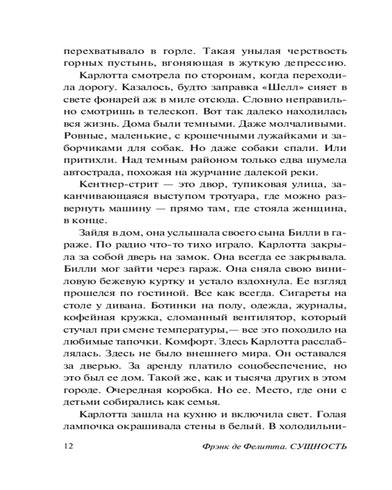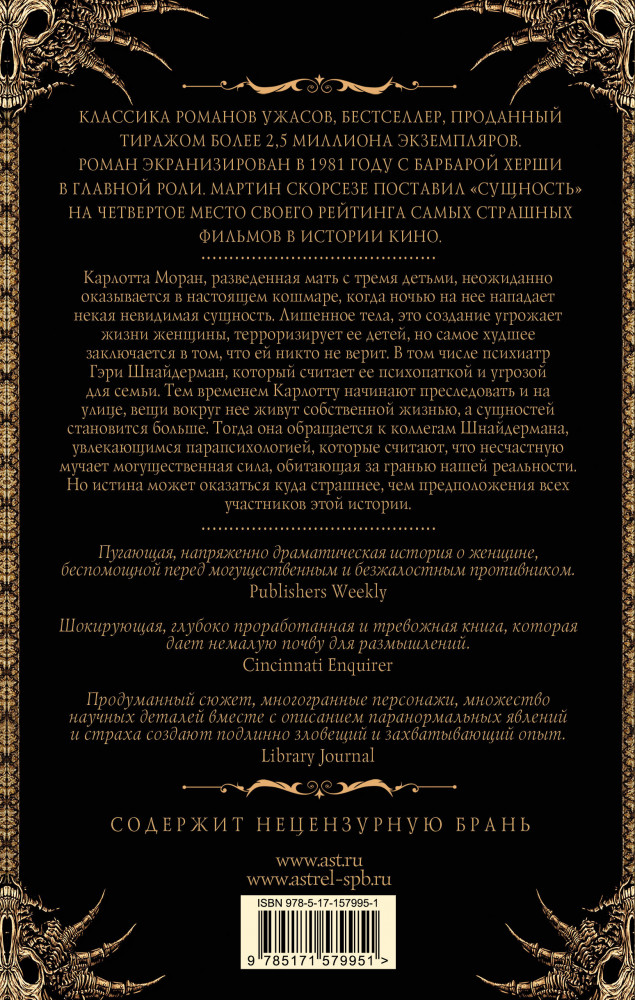 💳 Оплатить за товар можно при получении 🇰🇿 Есть бесплатная доставка по Казахстану от 1 дня 🎁 Копите бонусы с каждой покупки Серия: Легенды хоррора Карлотта Моран, разведенная мать с тремя детьми, неожиданно оказывается в настоящем кошмаре, когда ночью на нее нападает некая невидимая сущность. Лишенное тела, это создание угрожает жизни женщины, терроризирует ее детей, но самое худшее заключается в том, что ей никто не верит. В том числе психиатр Гэри Шнайдерман, который считает ее психопаткой и угрозой для семьи. Тем временем Карлотту начинают преследовать и на улице, вещи вокруг нее живут собственной жизнью, а сущностей становится больше. Тогда она обращается к коллегам Шнайдермана, увлекающимся парапсихологией, которые считают, что несчастную мучает могущественная сила, обитающая за гранью нашей реальности. Но истина может оказаться куда страшнее, чем предположения всех участников этой истории. |