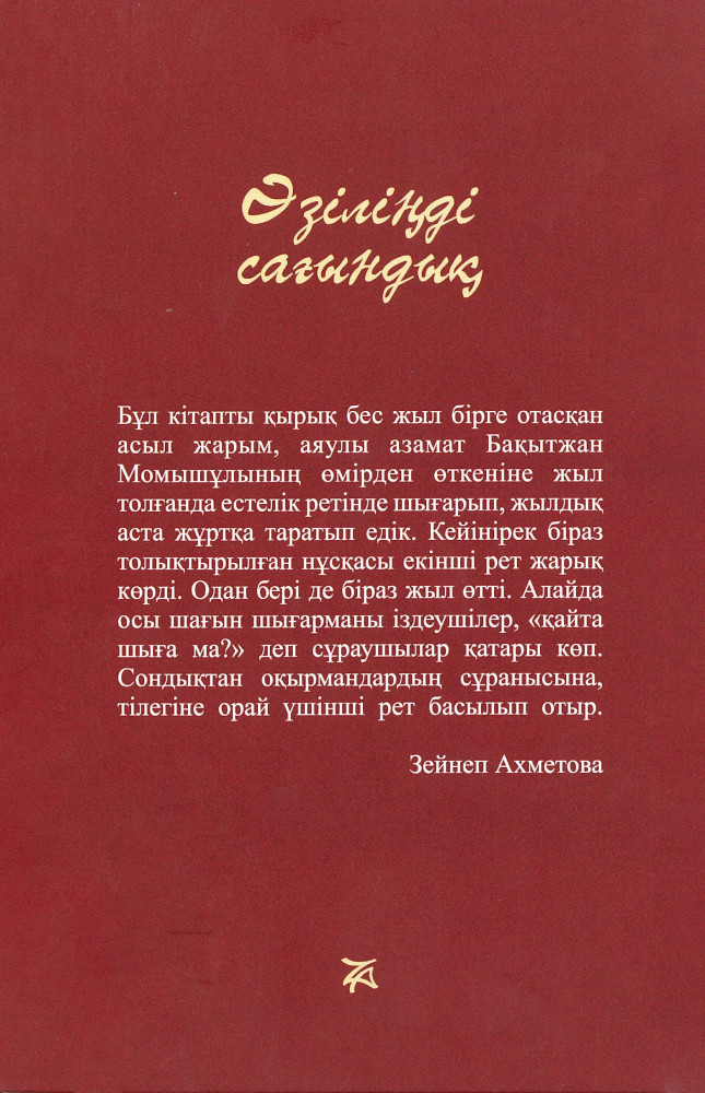 💳 Оплатить за товар можно при получении 🇰🇿 Есть бесплатная доставка по Казахстану от 1 дня 🎁 Копите бонусы с каждой покупки «Әзіліңді сағындық» кітабын Зейнеп Ахметова апамыз асыл жары, аяулы азамат Бақытжан Момышұлыны ел айналасына шуақ шаша күлдіретін сәттерін көз алдарына елестетіп, көтеріңкі көңілмен естеріне алсын деген ниетте өмірден өткеніне жыл толғанда естелік ретінде шығарып, жылдық асында жұртқа таратқан екен. |