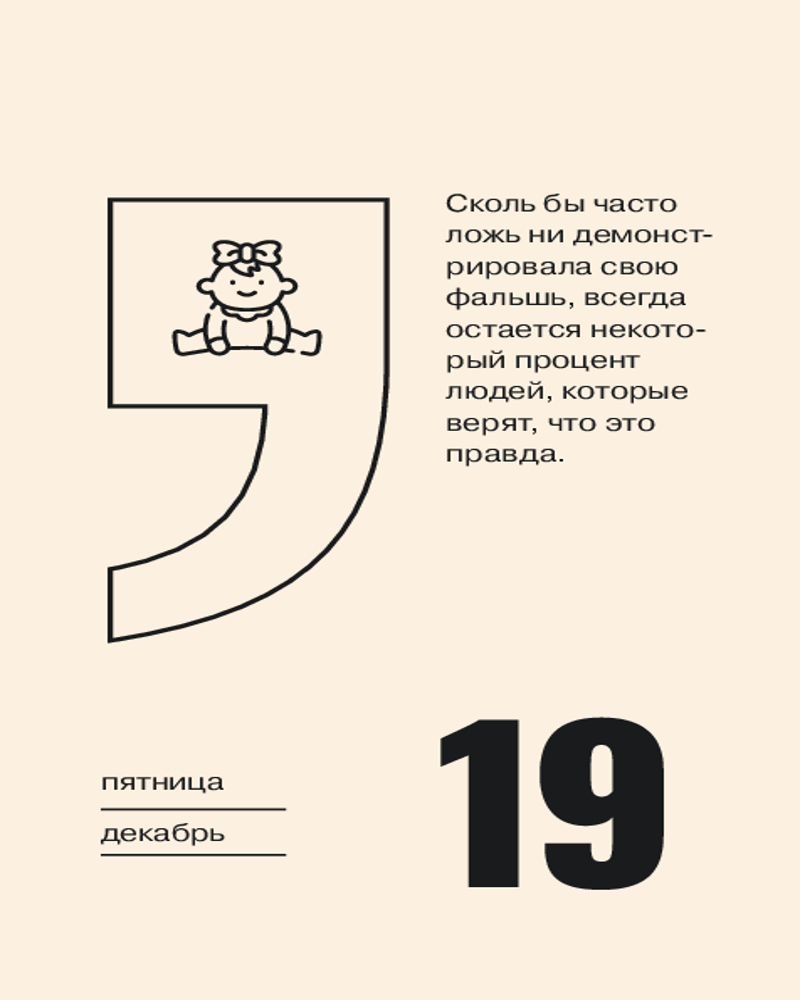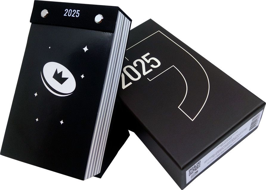 Настольный календарь вложен в картонную коробку, которая заменяет подарочную упаковку и защищает от повреждений. Ни одна страница не загнется и не испортится при доставке или пересылке подарка. Листы надежно держатся на металлическом крепеже и теперь отрываются еще легче благодаря перфорации. Черные и белые страницы складываются в стильный интересный срез. Отрывной календарь задаст хорошее настроение на каждый день. Он будет отличным подарком или дополнением к любому празднику. О вас будут с улыбкой вспоминать весь год!