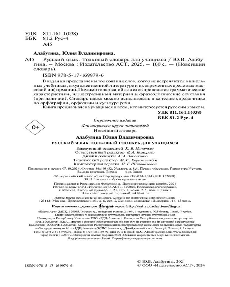 💳 Оплатить за товар можно при получении 🇰🇿 Есть бесплатная доставка по Казахстану от 1 дня 🎁 Копите бонусы с каждой покупки Серия: Новейший словарь В издании представлены толкования слов, которые встречаются в школьных учебниках, в художественной литературе и в современных средствах массовой информации. Помимо толкований для слов приводятся грамматические характеристики, иллюстративный материал и фразеологические сочетания (при наличии). Словарь также можно использовать в качестве справочника по орфографии, орфоэпии и культуре речи. Книга предназначена учащимся и всем, кто интересуется русским языком. |