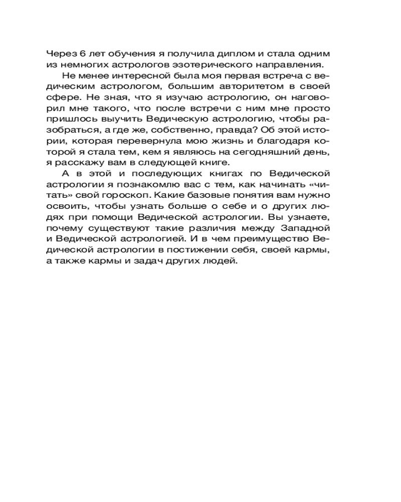 Очень сложно принять тот факт, что планеты влияют на нашу судьбу. Но это влияние существует независимо от того, верит ли сам человек в него или нет. У нас есть выбор: идти вслепую, полагая, что мы найдем выход из жизненных лабиринтов и методом проб и ошибок выйдем на ровную поверхность, или взять в руки проверенный веками компас — гороскоп. Он определяет черты характера, профессию, здоровье, таланты, благополучие, личную жизнь... Знание собственного гороскопа абсолютно не ограничивает нашу жизнь! Ведь постигая себя, узнавая всё больше и больше, мы начинаем расширять свои возможности и выходить за пределы влияния гороскопа. В этой книге мы начнем рассматривать Ведическую астрологию с двух самых важных положений в Ведическом гороскопе — асцендента и Луны. |