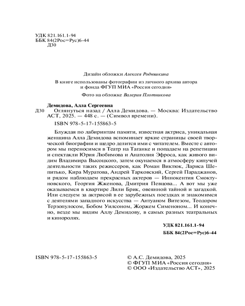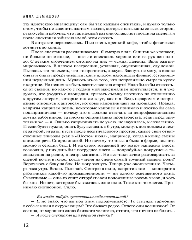 💳 Оплатить за товар можно при получении 🇰🇿 Есть бесплатная доставка по Казахстану от 1 дня 🎁 Копите бонусы с каждой покупки Серия: Символ времени Блуждая по лабиринтам памяти, известная актриса, уникальная женщина Алла Демидова вспоминает яркие страницы своей творческой биографии и щедро делится ими с читателем. Вместе с автором мы переносимся в Театр на Таганке и попадаем на репетиции и спектакли Юрия Любимова и Анатолия Эфроса, как живого видим Владимира Высоцкого, затем окунаемся в атмосферу кипучей деятельности таких режиссеров, как Роман Виктюк, Лариса Шепитько, Кира Муратова, Андрей Тарковский, Сергей Параджанов, и рядом наблюдаем прекрасных актеров — Иннокентия Смоктуновского, Георгия Жженова, Дмитрия Певцова... А вот мы уже оказываемся в квартире Лили Брик, овеянной тайной и загадкой. Или следуем за актрисой в ее зарубежных поездках и знакомимся с деятелями западного искусства — Антуаном Витезом, Теодором Терзопулосом, Бобом Уилсоном, Жоржем Сименоном... И конечно, везде мы видим Аллу Демидову в самых разных театральных и киноролях. |