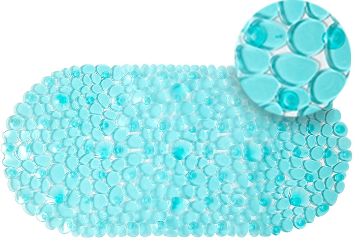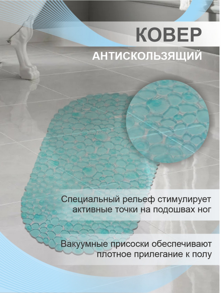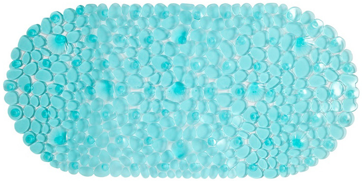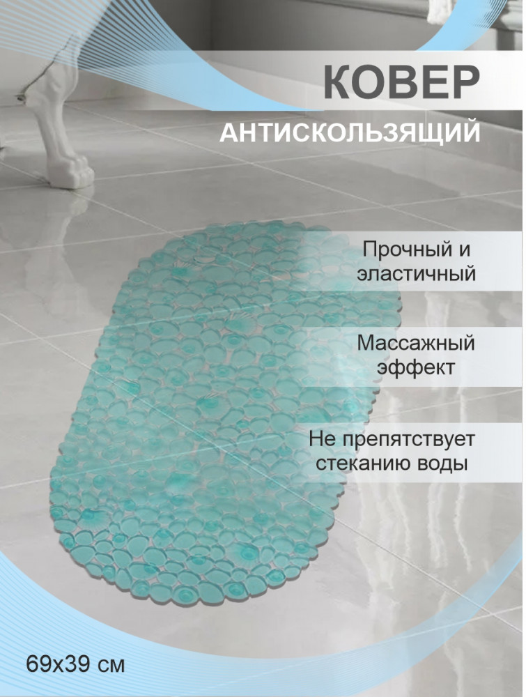 Коврик прозрачный, но не бело-прозрачный, а с голубовато сиреневым отливом. Размер, немного меньше заявленного в описании, где то по 1,5см в длину с обеих сторон. Еще не использовали, поэтому позже дополню отзыв, насколько хорошо прилипает к поверхности.