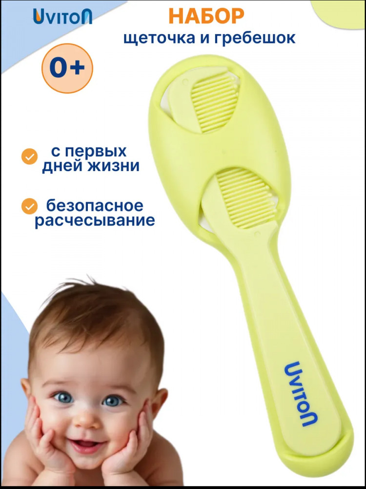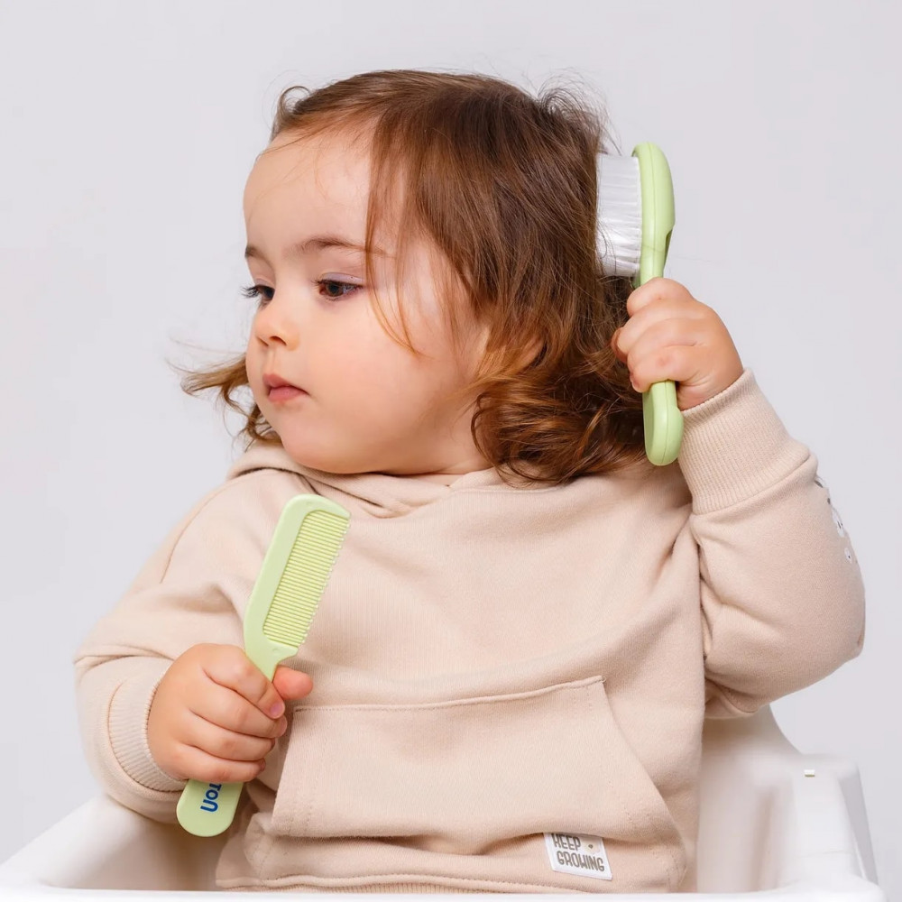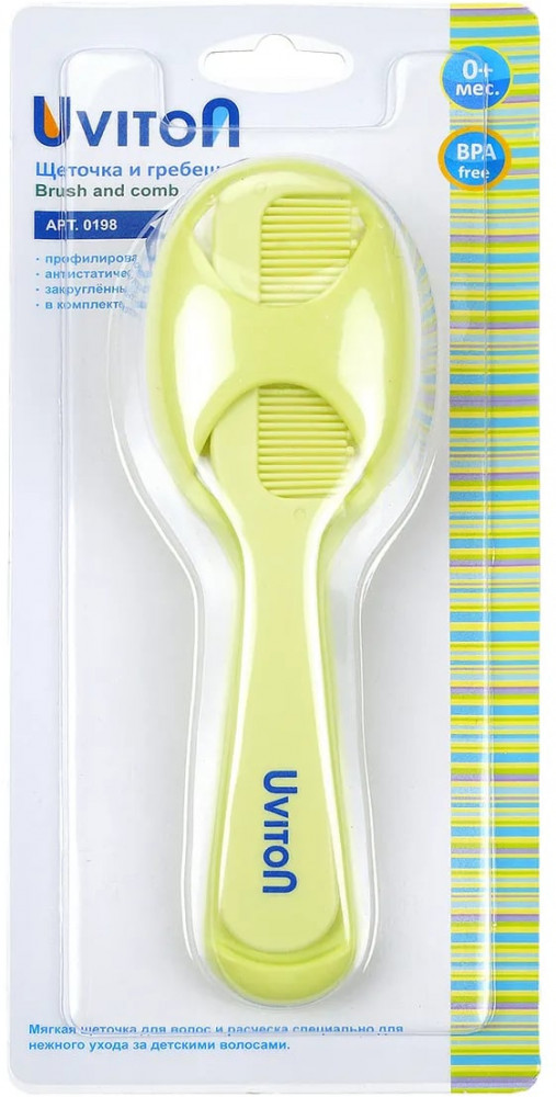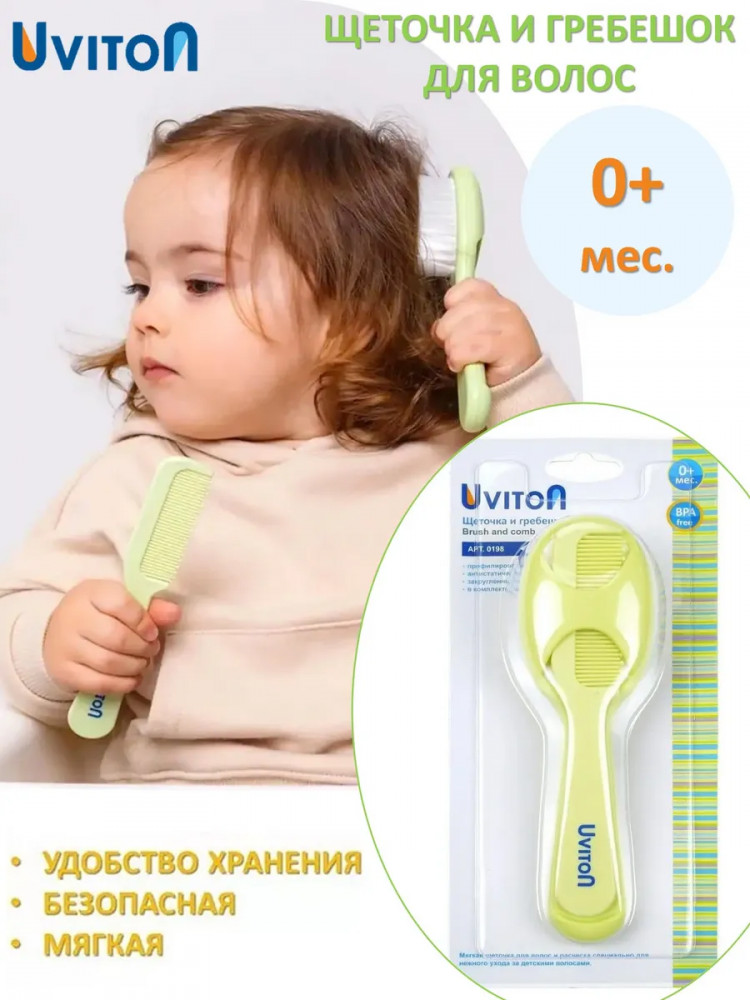 Мягкая щеточка для волос и гребешок от Uviton специально для нежного ухода за детскими волосами. Современный дизайн, эргономичная ручка. Удобное хранение — теперь гребешок не потеряется, его можно прикрепить в щеточке экономя место для хранения аксессуара.