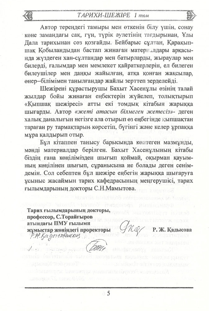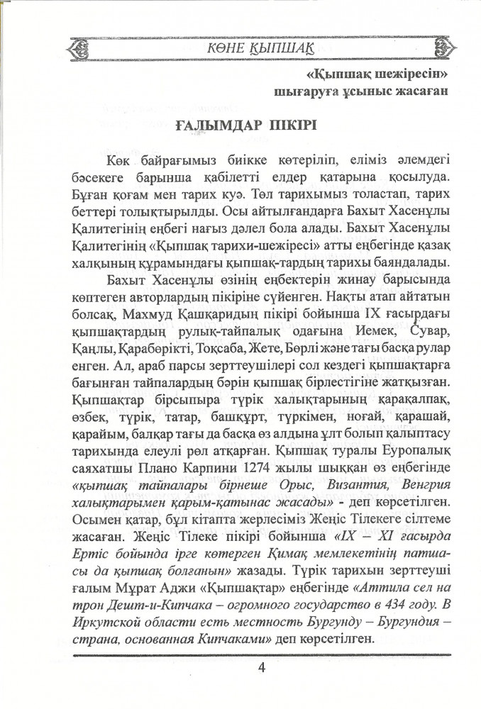 Бұл кітап - өзін қыпшақ-қазақпын деп санайтын азаматтардың бір-біріне сыйлық ретінде беретін, әр шаңырағының төрінде тұратын, ұрпақтан-ұрпаққа қалдыратын, сыйлы қонақтарына ата-бабалары мен дарындыларын таныстырып, жайып салатын - энциклопедиясы спетті баға жетпес қазына, мәдени мұрамыз, тарихи төл шежіреміз.