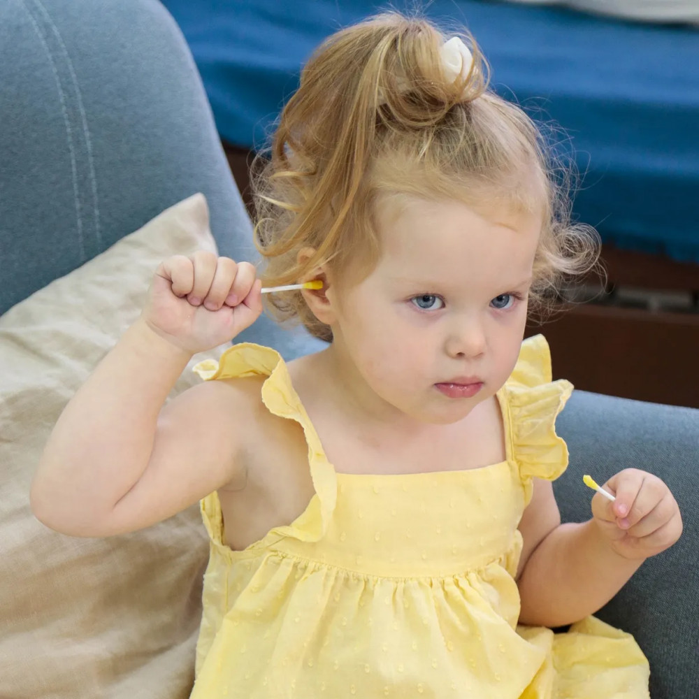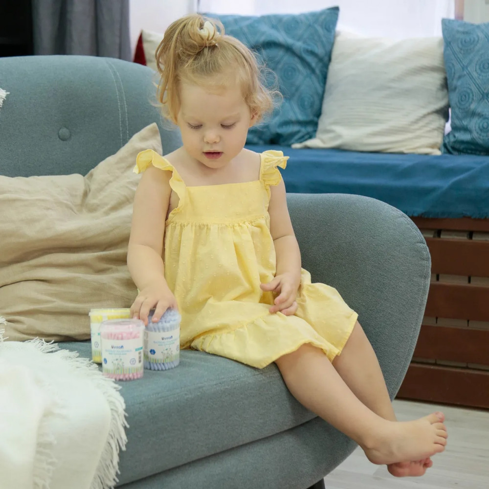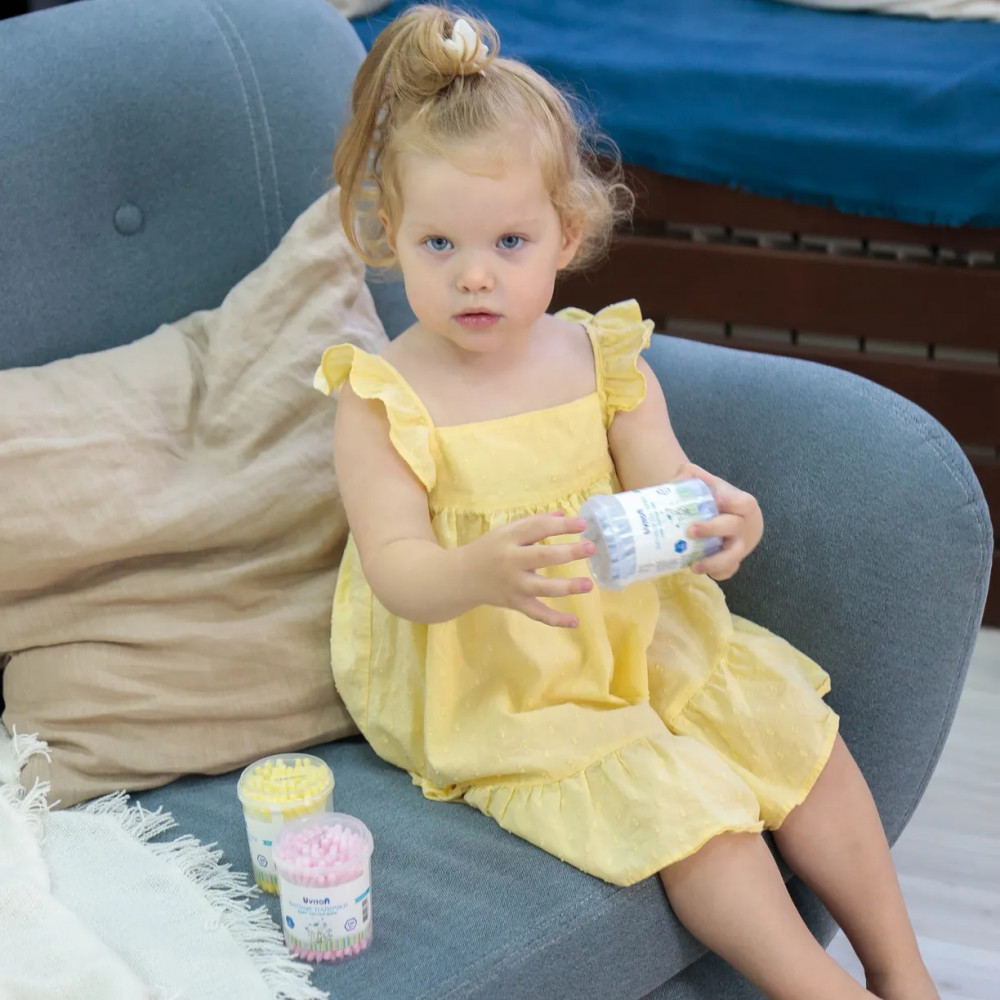 Мягкая хлопковая вата намотана на полипропиленовую основу которая при сильном нажатии гнется и не ломается, что исключает возможность нанесения травмы ребенку. Они подходят для того, чтобы чистить уши деткам и взрослым. Можно использовать для нанесения медицинских препаратов (йод или зеленка), очищая ранки и удалять загрязнения. Можно наносить макияж.