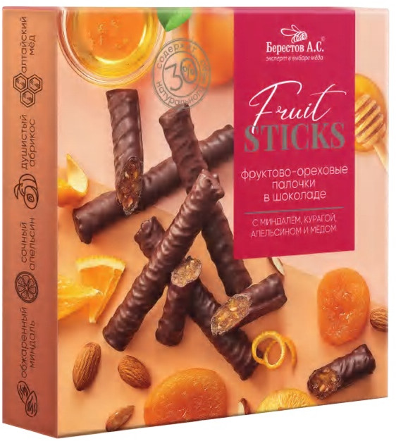 Берестов А.С. Конфеты с курагой, миндалём и цукатами апельсина в шоколаде «FruitSticks»
