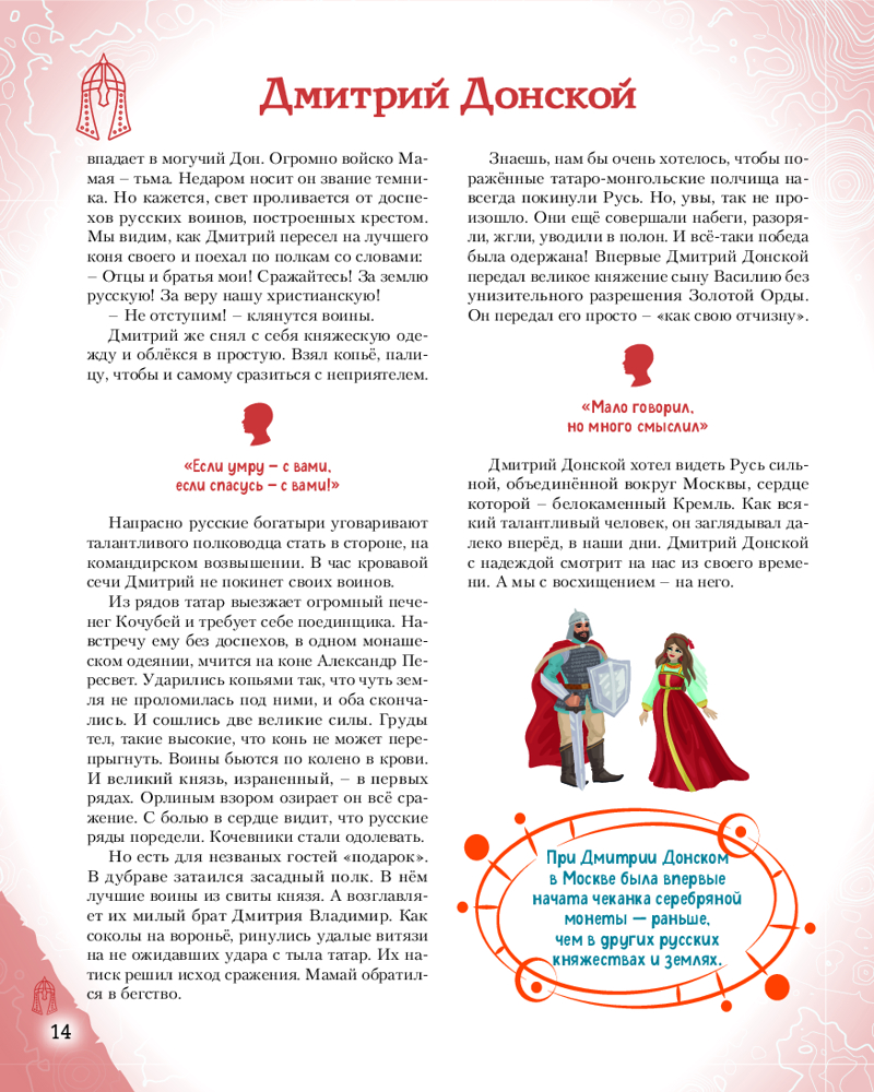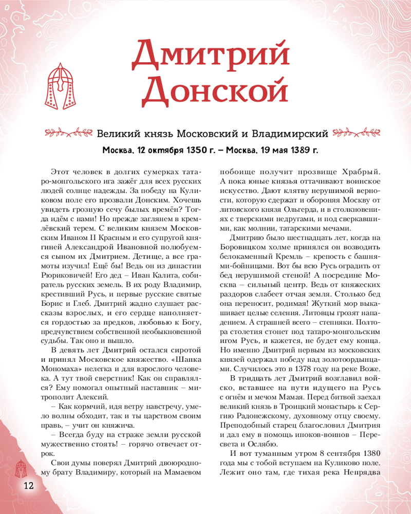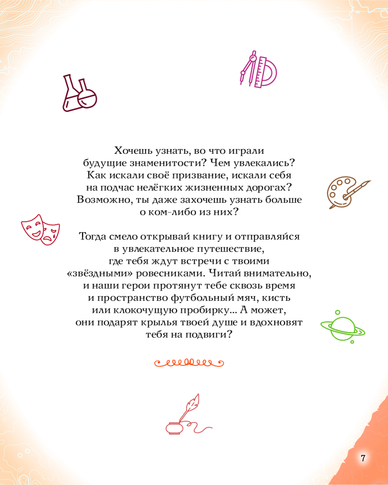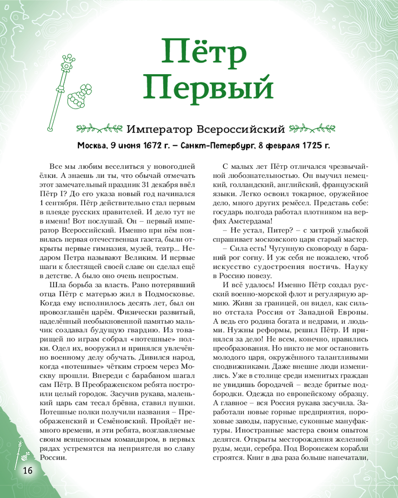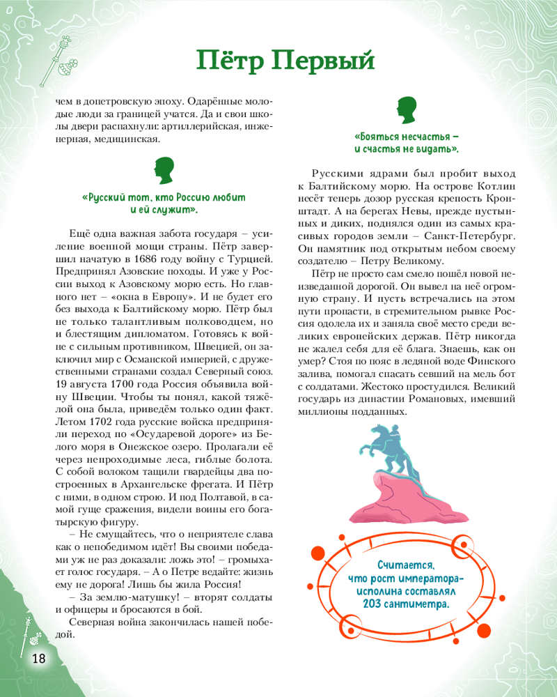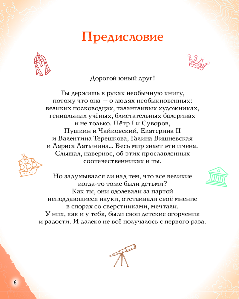 💳 Оплатить за товар можно при получении 🇰🇿 Есть бесплатная доставка по Казахстану от 1 дня 🎁 Копите бонусы с каждой покупки Серия: Великие люди великой страны Такие имена, как Пётр Первый, Александр Суворов, Екатерина Вторая, Пётр Чайковский, Софья Ковалевская, знает любой человек в нашей стране. Но все великие люди тоже когда-то были детьми. Хотите узнать, во что играли будущие исторические личности? Чем увлекались в детстве? Как искали свой путь, искали себя на нелёгких жизненных дорогах? Ведь они так же, как и все мы, одолевали за партой неподдающиеся науки, отстаивали собственное мнение в спорах; у них были свои детские огорчения и радости. И далеко не всё получалось с первого раза... |