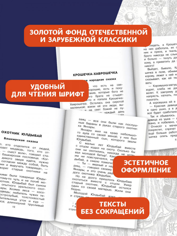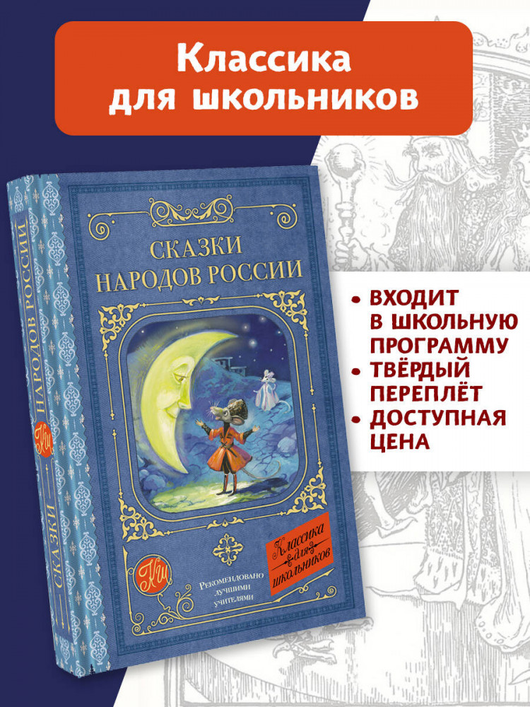 Сказки народов РоссииВ данный момент этот товар отсутствует в продаже. Возможно, у нас найдется аналогичный или похожий товар здесь. Серия: Классика для школьников На территории многонациональной России проживает более 180 народов, и у каждого из них есть свои неповторимые фольклорные сюжеты и сказочные герои. Мудрость народа, его уникальные традиции и представления о мире находят отражение в сказках. Храбрый охотник Юлдыбай — у башкир, мудрый филин — у тувинцев, находчивый Олешек Золотые Рожки — у саамов. Такие разные сказки учат нас одним и тем же ценностям — доброте, смелости и бескорыстию. В книгу вошли сказки народов Кавказа, Поволжья, Сибири и Дальнего Севера, рекомендованные к чтению в школе. |