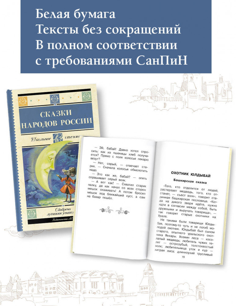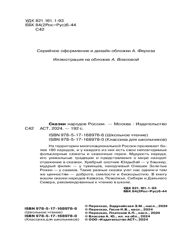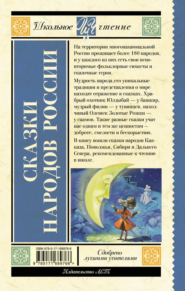 💳 Оплатить за товар можно при получении 🇰🇿 Есть бесплатная доставка по Казахстану от 1 дня 🎁 Копите бонусы с каждой покупки Серия: Школьное чтение На территории многонациональной России проживает более 180 народов, и у каждого из них есть свои неповторимые фольклорные сюжеты и сказочные герои. Мудрость народа, его уникальные традиции и представления о мире находят отражение в сказках. Храбрый охотник Юлдыбай — у башкир, мудрый филин — у тувинцев, находчивый Олешек Золотые Рожки — у саамов. Такие разные сказки учат нас одним и тем же ценностям — доброте, смелости и бескорыстию. В книгу вошли сказки народов Кавказа, Поволжья, Сибири и Дальнего Севера, рекомендованные к чтению в школе. |