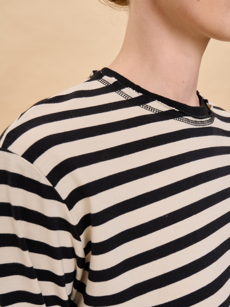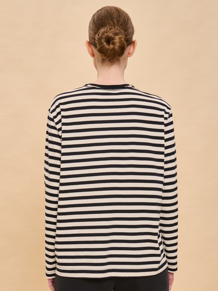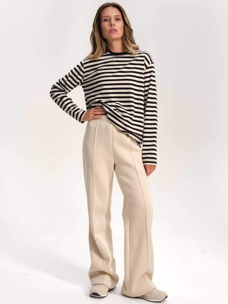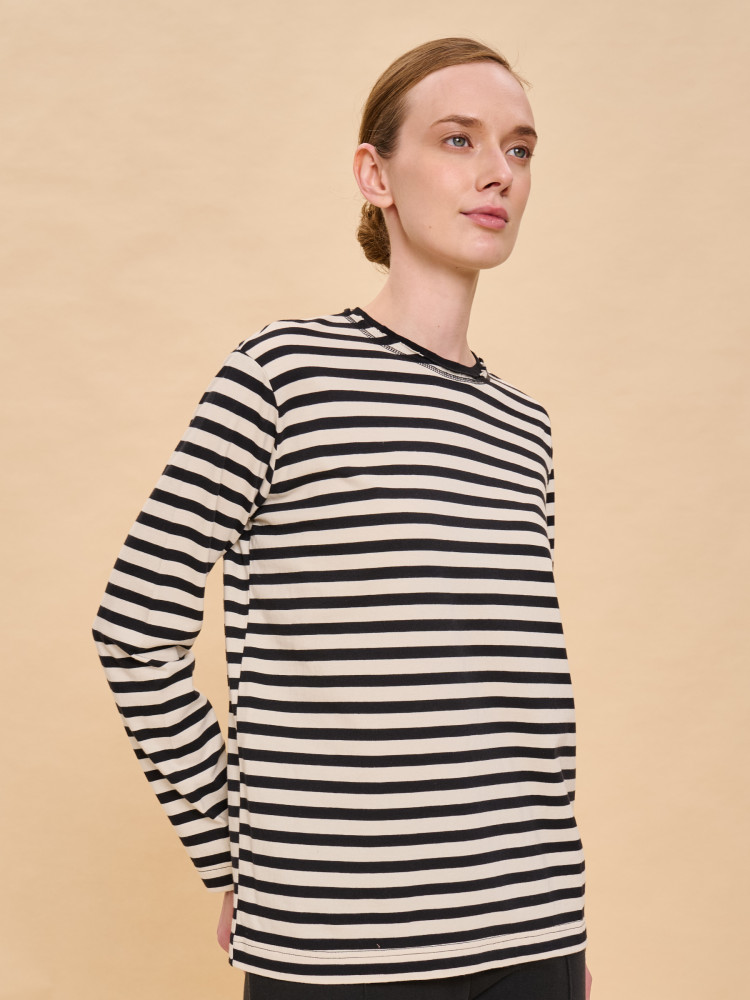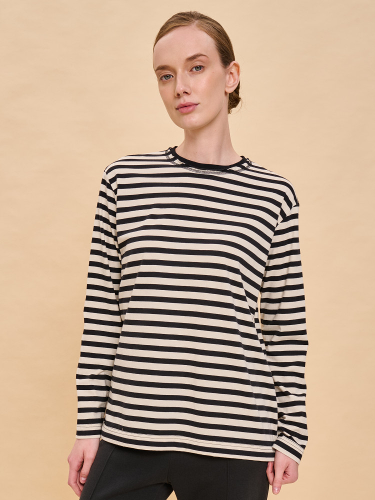 Лонгслив среднего объёма для женщин. Модель расслабленного силуэта в полоску дополнена комфортными прямыми длинными рукавами. Горловина обработана оригинальной обтачкой с открытым срезом и декоративной строчкой. В составе ткани 100% высококачественного хлопка — джемпер дышащий, мягкий и приятный на ощупь. Лонгслив однотонный, без принта, неприхотлив в уходе.