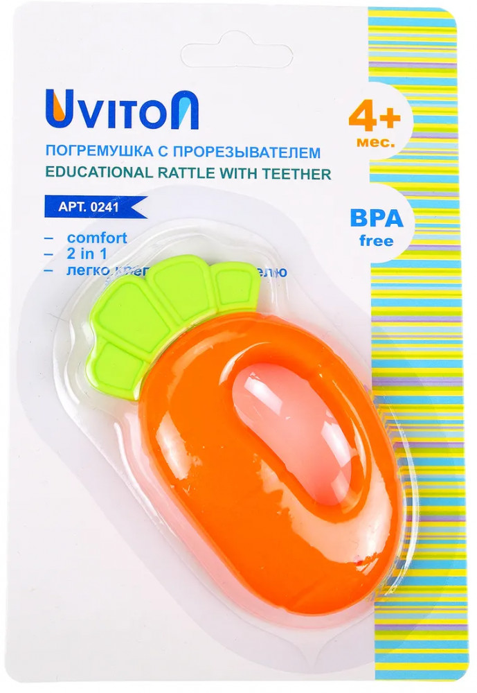 Uviton Погремушка-прорезыватель «Морковка»В данный момент этот товар отсутствует в продаже. Возможно, у нас найдется аналогичный или похожий товар здесь. Серия: Juicy Для самых маленьких представляем «сочную» погремушку от Uviton «Juicy», она отличается прекрасным дизайном и высоким качеством применяемых для изготовления материалов. Играя с погремушкой, ребенок развивает моторику пальцев, внимание, наблюдательность, координацию движений, слуховые и зрительные навыки. Рельефные поверхности послужат отличным массажером для десен, они изготовлены из силикона. Специально разработанная ручка для захвата игрушки маленькими ладошками. Легкая. Любому малышу обязательно понравится яркое сочетание цветов, от которых ребёнок придёт в полный восторг. Перед началом использования необходимо промыть игрушку в теплой воде с мылом, не кипятить. |