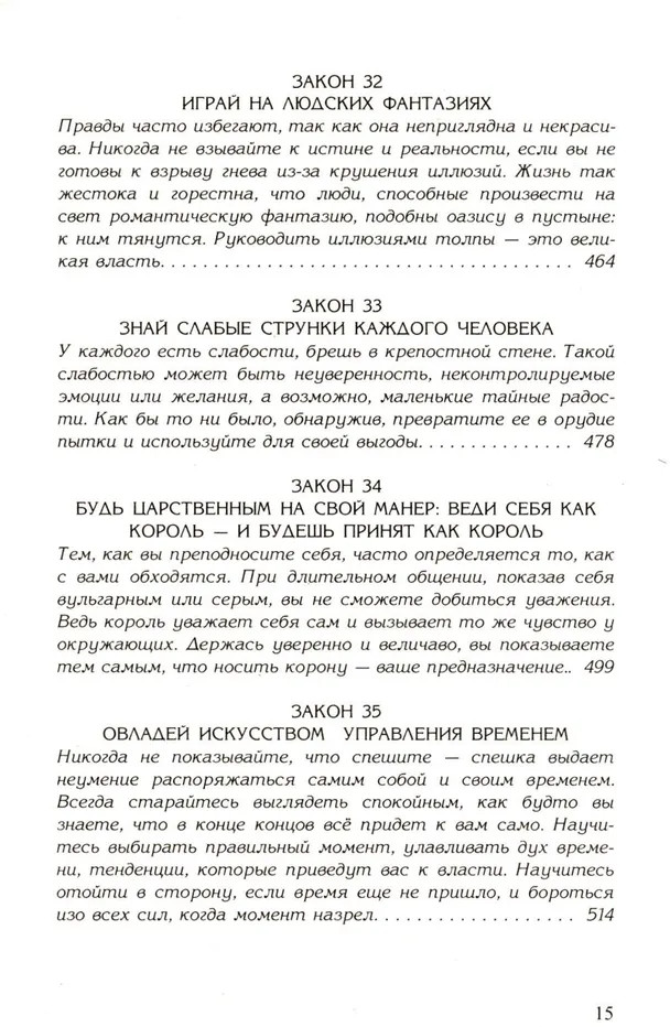 Это самая аморальная, самая скандальная, самая циничная... и самая правдивая книга о власти, начиная с незамысловатой, бытовой и кончая президентской. Отныне, познав блестяще сформулированные и подкрепленные интереснейшими и неожиданными историческими факторами жесткие и жестокие законы поведения во власти, вы без труда распознаете то, что стоит за теми или иными словами и поступками «маленьких» начальников и сильных мира сего, то, что так тщательно они пытаются скрыть. «48 законов власти» — настольная книга для тех, кто желает освоить науку управления людьми, безошибочно использовать их слабости для достижения собственного могущества.