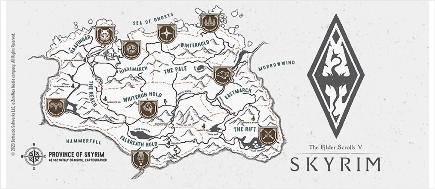 ABYstyle Кружка «Skyrim Map»В данный момент этот товар отсутствует в продаже. Возможно, у нас найдется аналогичный или похожий товар здесь. Серия: Skyrim Кружка Skyrim Map 320 мл по мотивам игры «The Elder Scrolls V: Skyrim». «The Elder Scrolls V: Skyrim» — компьютерная игра в жанре action/RPG с открытым миром. Подобно предыдущим играм серии, Skyrim предоставляет игроку возможность свободно путешествовать по обширному игровому миру, исследуя его и самостоятельно находя новые места и задания. Сюжет игры в жанре классического фэнтези использует мотивы скандинавской мифологии, а также понятия и атрибутику эпохи викингов. |