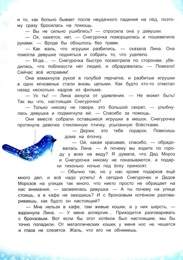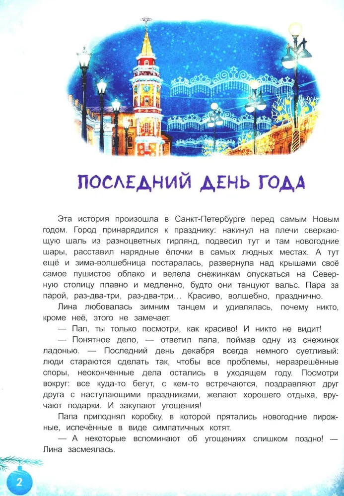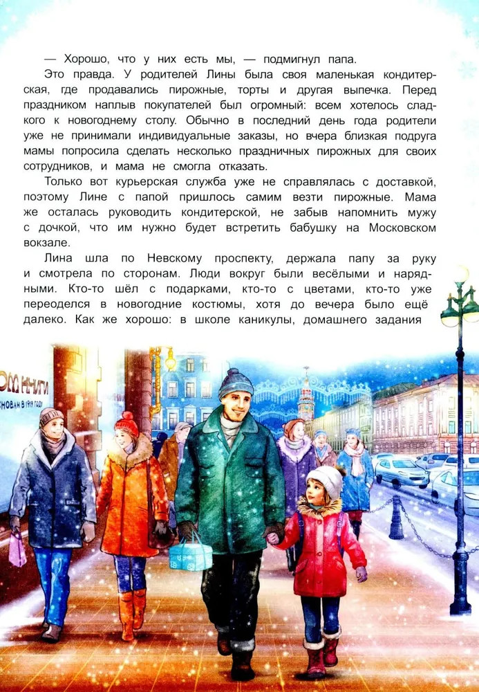 💳 Оплатить за товар можно при получении 🇰🇿 Есть бесплатная доставка по Казахстану от 1 дня 🎁 Копите бонусы с каждой покупки Серия: Города и чудеса Близится Новый год, и город особенно прекрасен: нарядные улицы, сверкающие гирлянды, украшенные витрины. В предпраздничной суете люди не замечают, что среди них по делам спешат и Дед Мороз со Снегурочкой. А значит, вот-вот начнутся чудеса... и захватывающие приключения! Девочке Лине и котёнку Фунтику предстоит встретить Новый год в самом центре Петербурга — у ёлки на Дворцовой площади... Только успеют ли они добраться туда до полуночи? Эта книга расскажет о заветном желании и настоящей дружбе, а ещё о том, что если верить в чудо, оно обязательно произойдёт! Книга предназначена для семейного и самостоятельного чтения детям от 5 лет. |
