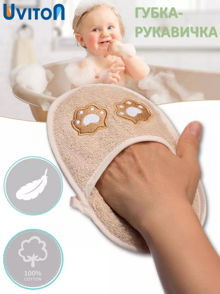 Детская мочалка для тела это средство для купания новорожденных. Рукавичка-мочалка Uviton для новорожденных — это мягкий и нежный аксессуар для купания, который обеспечивает деликатный уход за кожей малыша. Она имеет размер 14 × 20 × 1.5 см, и специальную петельку, чтобы повесить на крючок, и округлое отверстие для головы младенца. Изготовлена из 100% хлопка махры, что делает ее мягкой и приятной на ощупь, а также гипоаллергенной.