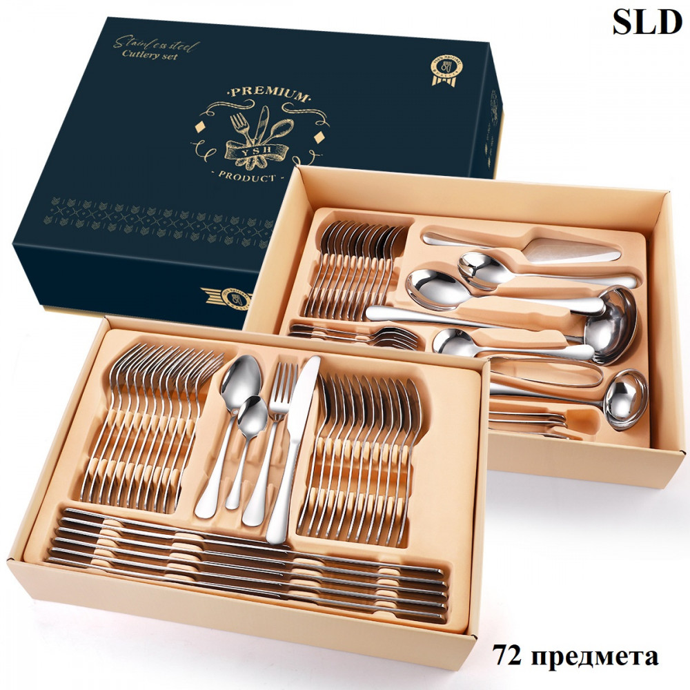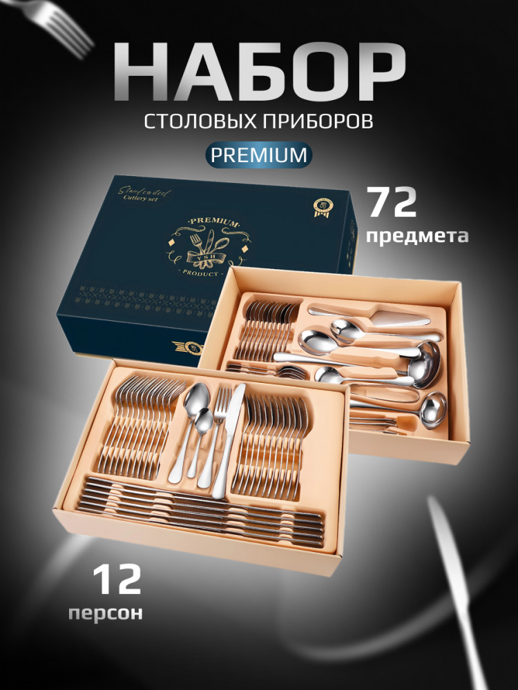 В данный момент этот товар отсутствует в продаже. Возможно, у нас найдется аналогичный или похожий товар здесь. Набор столовых приборов из 72 предметов для 12 персон — это идеальное сочетание элегантности и функциональности, включающее все необходимые предметы для сервировки стола дома или на кухне. Комплект состоит из столовых ложек, вилок, ножей и чайных ложек, обеспечивая полный сервис на 12 персон.