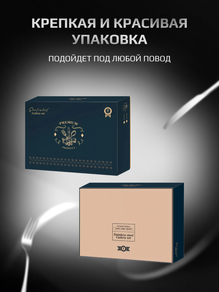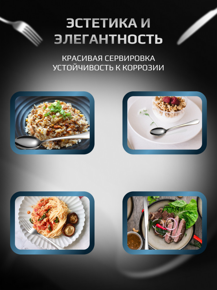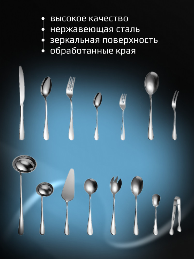 Столовые приборы, рассчитанные на 12 персон, отличаются практичностью и удобством в использовании. Каждый элемент, будь то ложка, вилка или нож, разработан с учетом эргономики, чтобы сделать процесс приема пищи максимально комфортным. Материал изготовления — высококачественная нержавеющая сталь, которая гарантирует долговечность и устойчивость к коррозии. Металлический блеск приборов придает им зеркальный эффект, добавляя эстетики вашему столу.