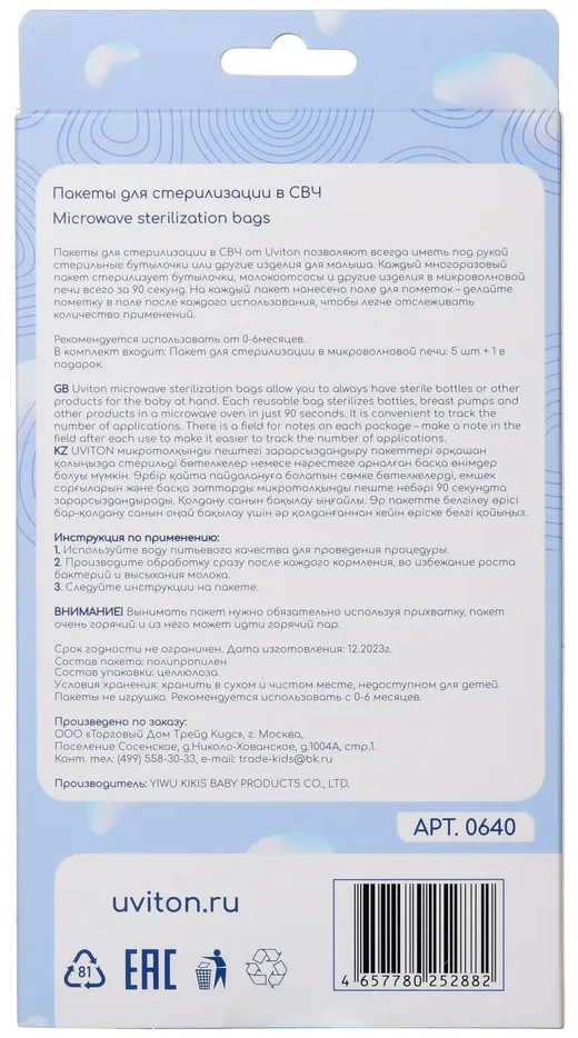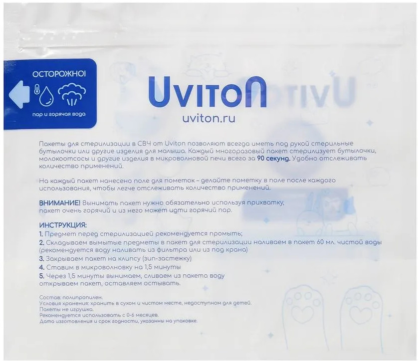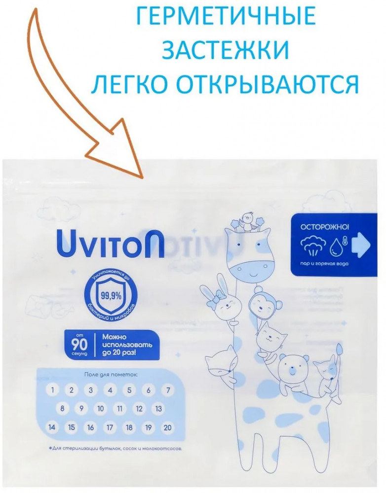💳 Оплатить за товар можно при получении 🇰🇿 Есть бесплатная доставка по Казахстану от 1 дня 🎁 Копите бонусы с каждой покупки Пакеты для стерилизации в СВЧ от Uviton позволяют всегда иметь под рукой стерильные бутылочки или другие изделия для малыша. Каждый многоразовый пакет стерилизует бутылочки, молокоотсосы и другие изделия в микроволновой печи всегда за 90 секунд. На каждый пакет нанесено поле для пометок — делайте пометку в поле после каждого использования, чтобы легче отслеживать количество применений. |