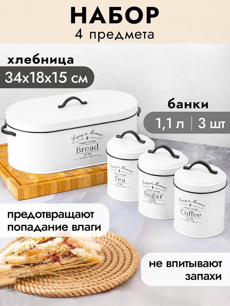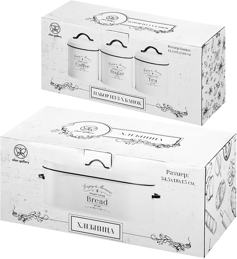 Набор Elan Gallery состоит четырёх предметов. В комплект входят овальная белая хлебница из металла размером 34,5×18×15 см с крышкой и набор из трёх банок для сыпучих продуктов. Круглые баночки размером 11,7×11,7×15,5 см и объёмом 1,1 литра. Каждая выполнены из металла и украшены надписями «Чай, кофе, сахар». Ёмкости закрываются крышками с удобными ручками. Металл в составе изделий обеспечивает прочность и долговечность использования.