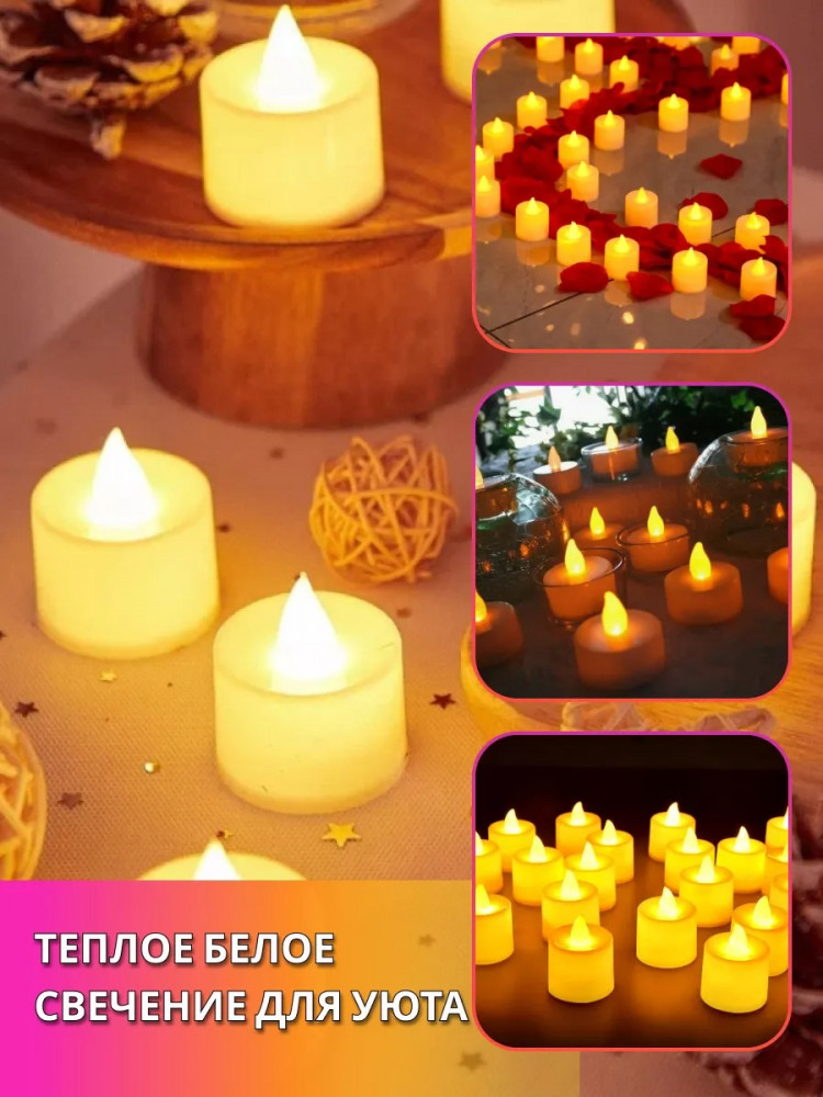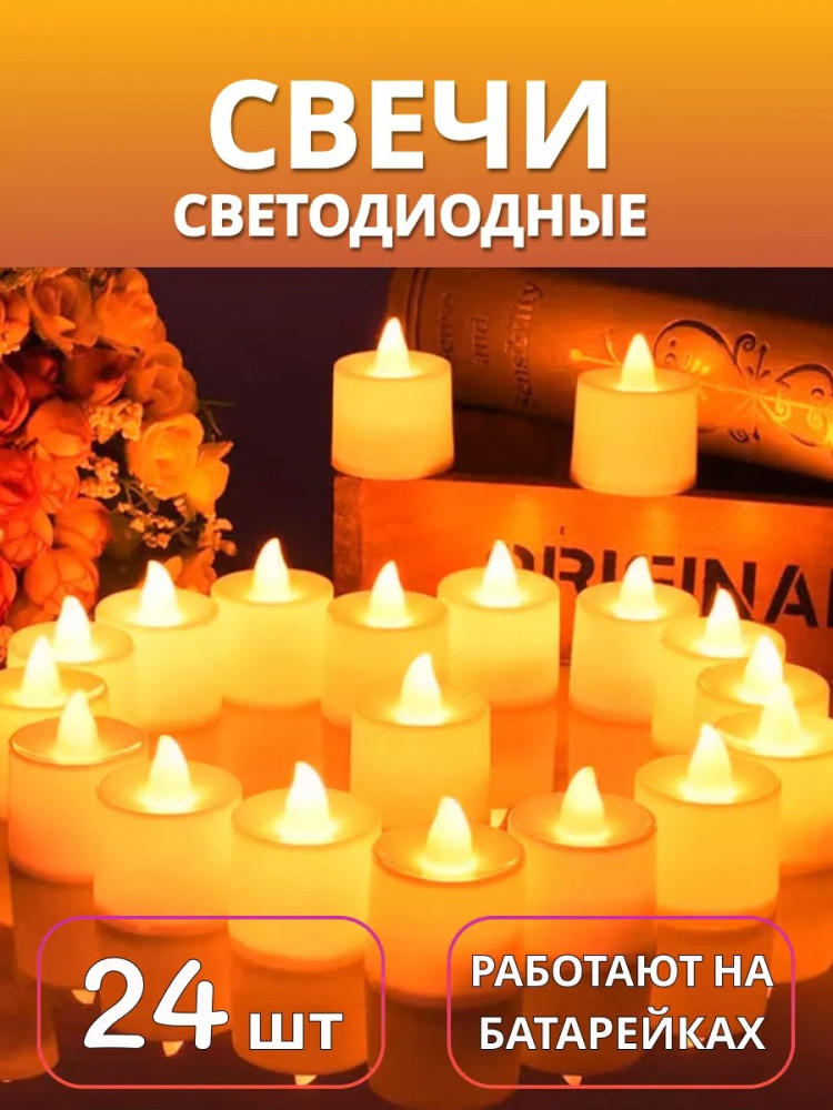 Для оформления интерьера эти свечки отличные светят хорошо Все 24 штуки из набора пришли исправные Создают уютную отмасферу в доме Работают от двух круглых батареек они идут уже в наборе в свечках Хотела ещё заказать но их нет в наличии