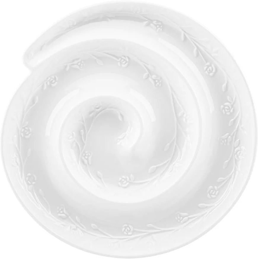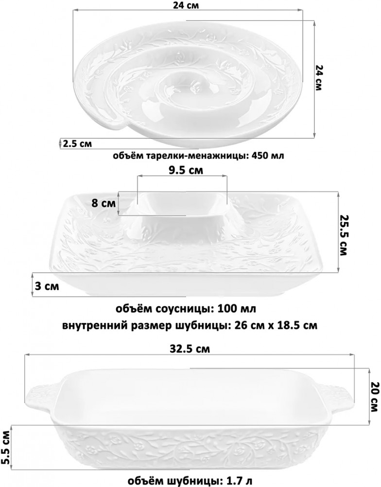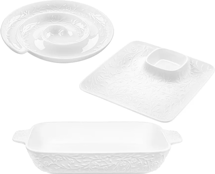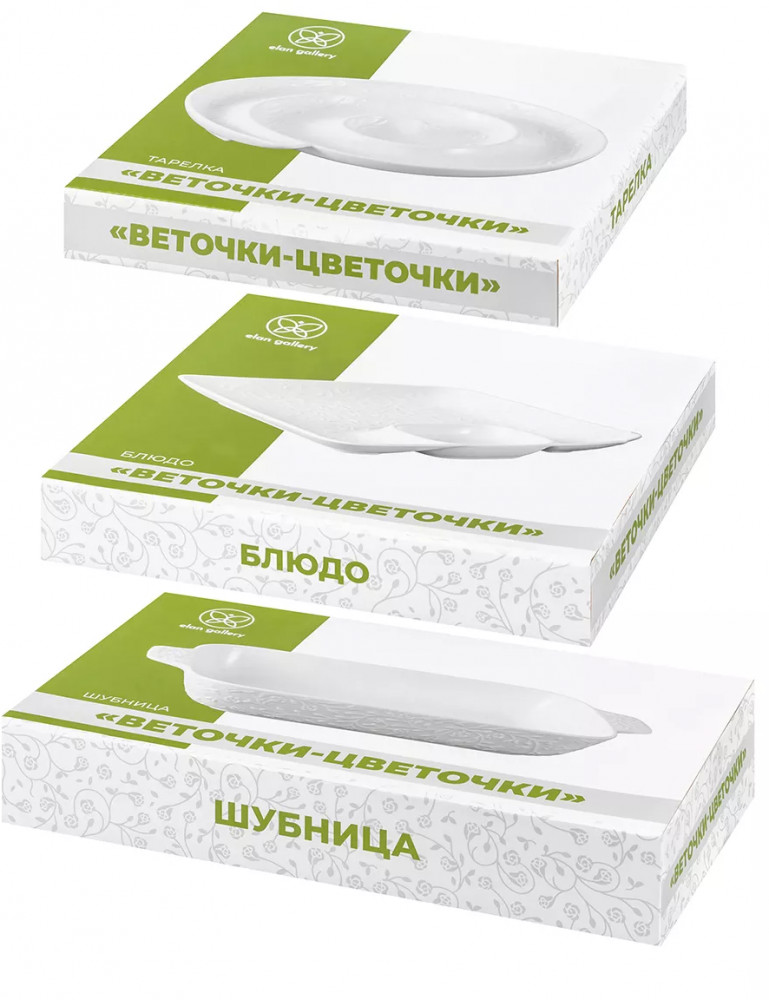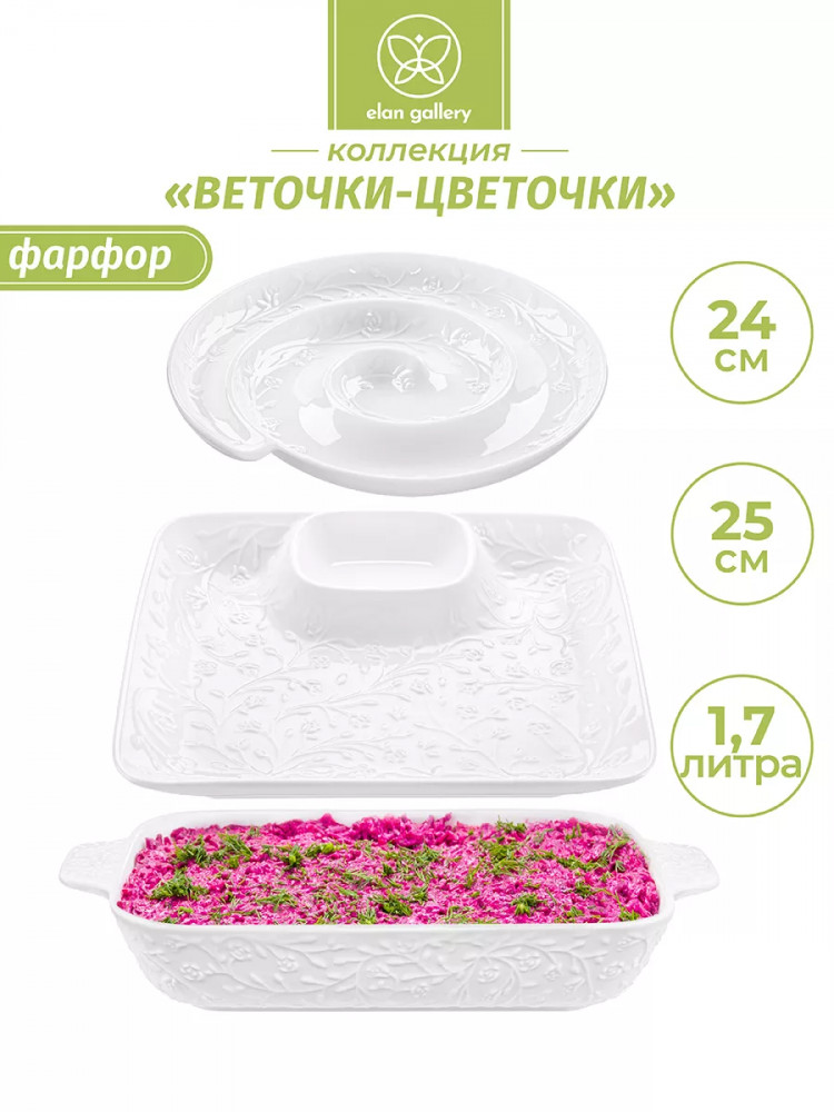 Набор Elan Gallery «Веточки-цветочки» состоит из трёх предметов и выполнен из белого фарфора в классическом стиле. Посуда серии украшена рельефным узором в виде изящных веточек с маленькими цветочками. Прямоугольное блюдо с соусницей подойдёт для подачи суши, ролл и шашлыка, так как вам не придётся искать отдельную ёмкость для соуса. Менажница в форме улитки подходит для сервировки различных закусок: сырной и мясной нарезки, канапе, роллов. Шубницу можно использовать для подачи сельди под шубой, салатов или плова.