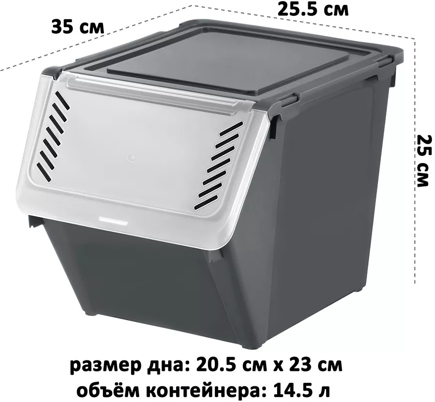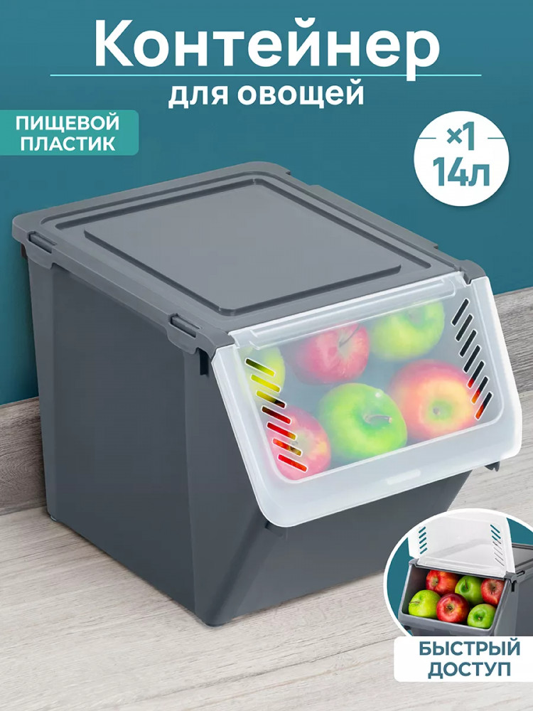 Контейнер объёмом 14,5 литра от El Casa поможет организовать хранение овощей. Ёмкость можно использовать как большой лоток для свежей зелени или под фрукты. Размер пластиковой коробки — 25,5×35×25 см, размер дна — 20,5×23 см. Овощной (фруктовый) бокс выполнен из пищевого пластика — полипропилена. Этот материал не содержит бисфенол А и не выделяет вредных веществ, поэтому идеально подходит для хранения продуктов. Короб имеет крышку с отверстиями для вентиляции, поэтому поможет надолго сохранить картофель, лук или чеснок свежими! Коробочка отлично подойдёт для любителей ягод или фруктов, ведь она вмещает большое количество яблок или мандаринов. Универсальный кухонный инвентарь станет удобным приспособлением для организации порядка в любом пространстве.