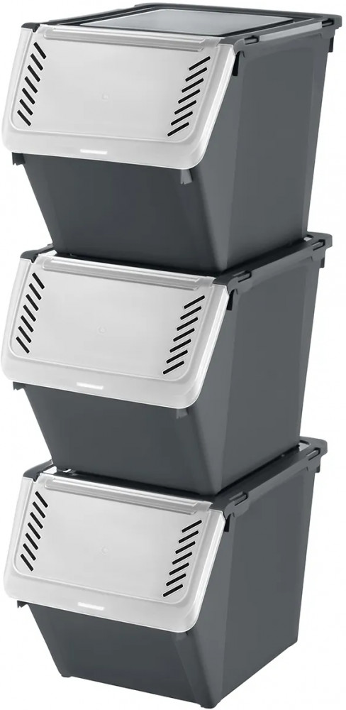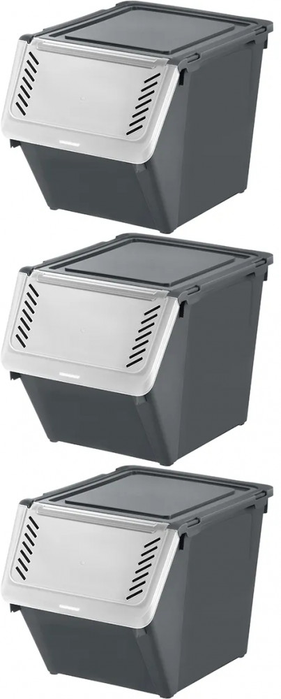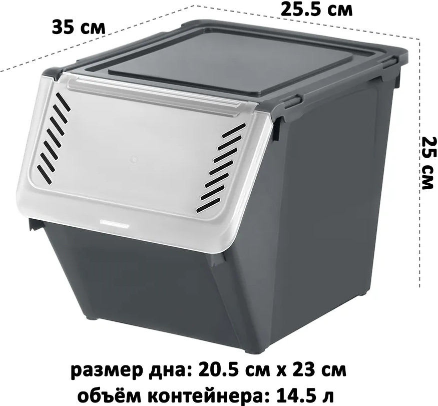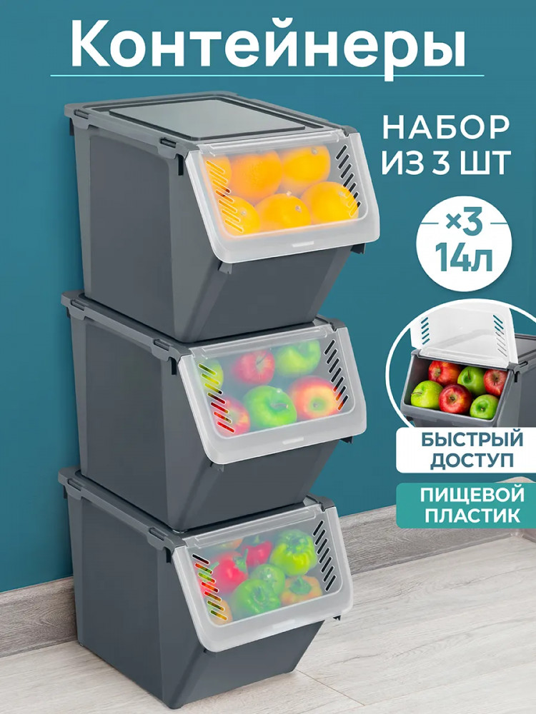 Набор из 3 контейнеров по 14,5 литра поможет организовать хранение овощей. Каждую ёмкость можно использовать как большой лоток для свежей зелени или под фрукты. Размер одной пластиковой коробки — 25,5×35×25 см, размер её дна — 20,5×23 см. Овощной (фруктовый) бокс выполнен из пищевого пластика — полипропилена. Этот материал не содержит бисфенол А и не выделяет вредных веществ, поэтому идеально подходит для хранения продуктов. Короб имеет крышку с отверстиями для вентиляции, поэтому поможет надолго сохранить картофель, лук или чеснок свежими! Коробочка отлично подойдёт для любителей ягод или фруктов, ведь она вмещает большое количество яблок или мандаринов. Универсальный кухонный инвентарь станет удобным приспособлением для организации порядка в любом пространстве.