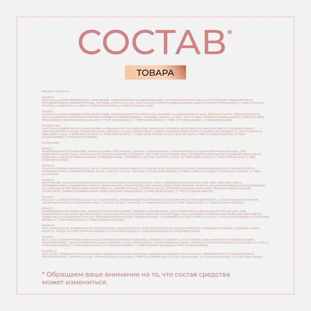 Shades 12: Mica, Silica, Boron Nitride, Dimethicone, Hydrogenated Polyisobutene, Magnesium Stearate, Polyethylene, Pentaerythrityl Tetraisostearate, Phenoxyethanol, Caprylyl Glycol, Triethoxycaprylylsilane, Ci 77007 (ultramarines), Ci 77491 (iron Oxides), Ci 77492 (iron Oxides), Ci 77499 (iron Oxides).