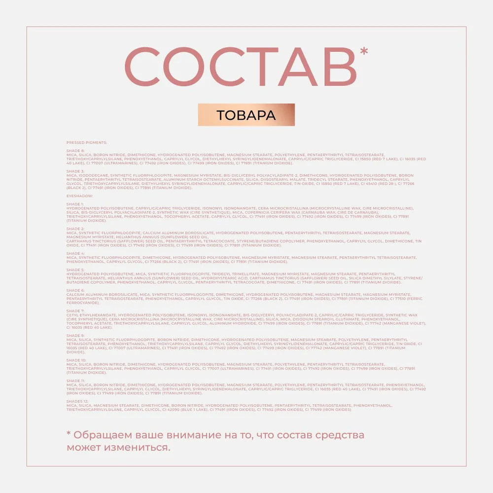 Shades 12: Mica, Silica, Magnesium Stearate, Dimethicone, Boron Nitride, Hydrogenated Polyisobutene, Pentaerythrityl Tetraisostearate, Phenoxyethanol, Triethoxycaprylylsilane, Caprylyl Glycol, Ci 42090 (blue 1 Lake), Ci 77491 (iron Oxides), Ci 77492 (iron Oxides), Ci 77499 (iron Oxides).