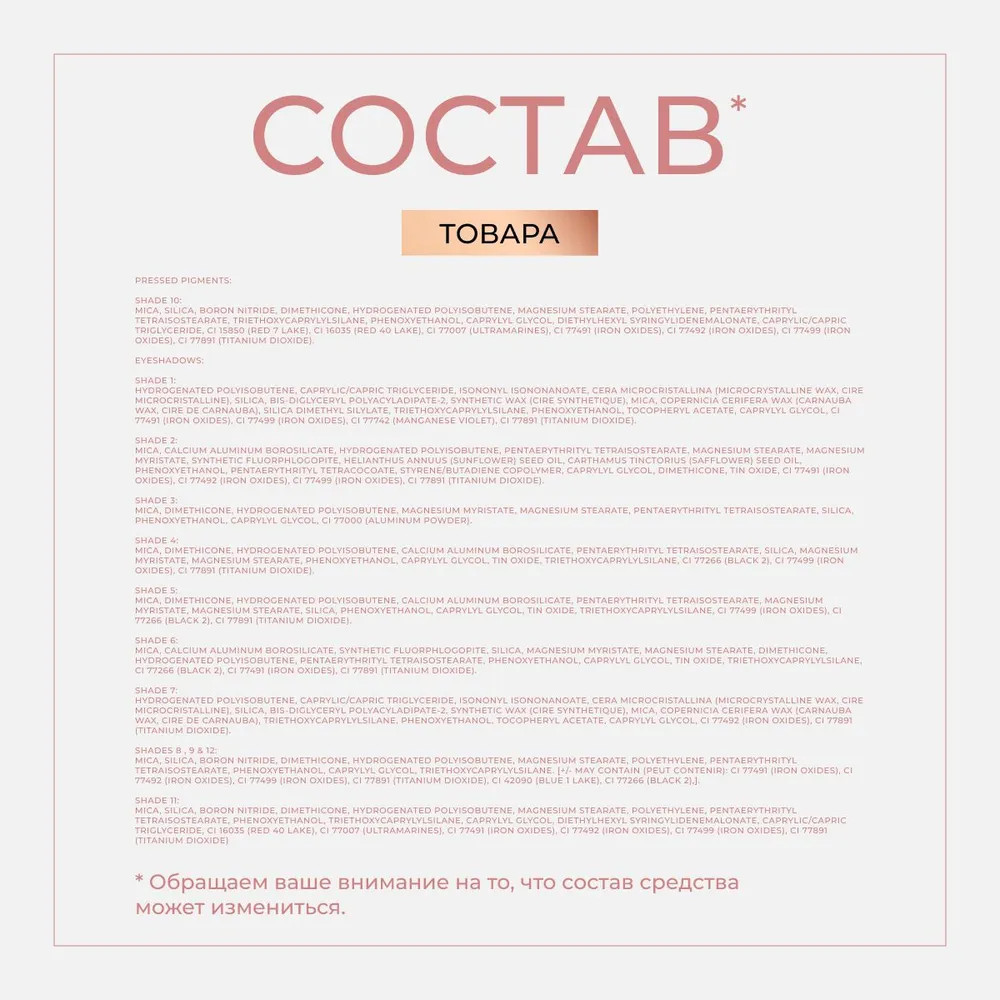 Shades 8, 9 & 12: Mica, Silica, Boron Nitride, Dimethicone, Hydrogenated Polyisobutene, Magnesium Stearate, Polyethylene, Pentaerythrityl Tetraisostearate, Phenoxyethanol, Caprylyl Glycol, Triethoxycaprylylsilane. [+/- May Contain (peut Contenir): Ci 77491 (iron Oxides), Ci 77492 (iron Oxides), Ci 77499 (iron Oxides), Ci 77891 (titanium Dioxide), Ci 42090 (blue 1 Lake), Ci 77266 (black 2),].