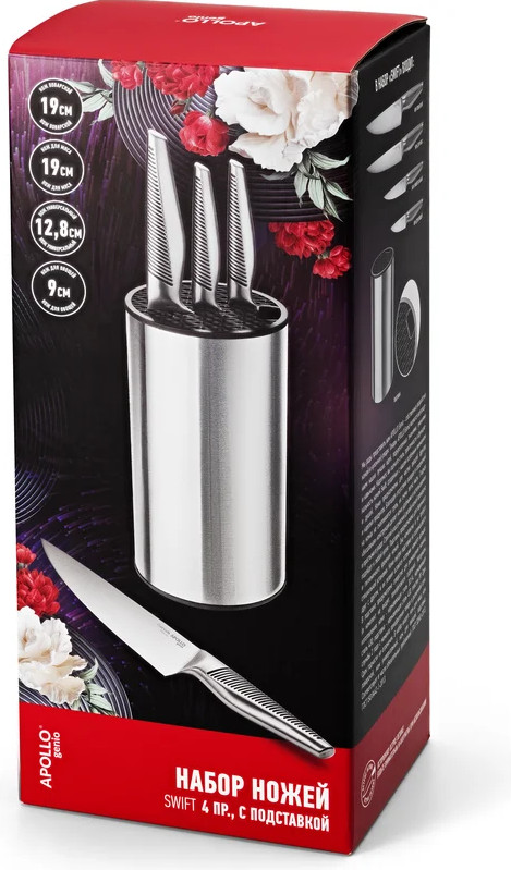 Ножи предназначены для чистки овощей/ фруктов и нарезки продуктов. Благодаря отсутствию зазоров и соединений на ножах не скапливается грязь, их очень легко мыть. Гладкая «бесшовная» конструкция делает ножи удобными в использовании и простыми в уходе. Строгий классический дизайн ножей прекрасно подойдет к любой кухне. Подставка предназначена для бережного и гигиеничного хранения ножей. Она компактна и не требует специальной установки. Ножи внутри подставки не соприкасаются друг с другом, и их лезвия остаются острыми намного дольше.