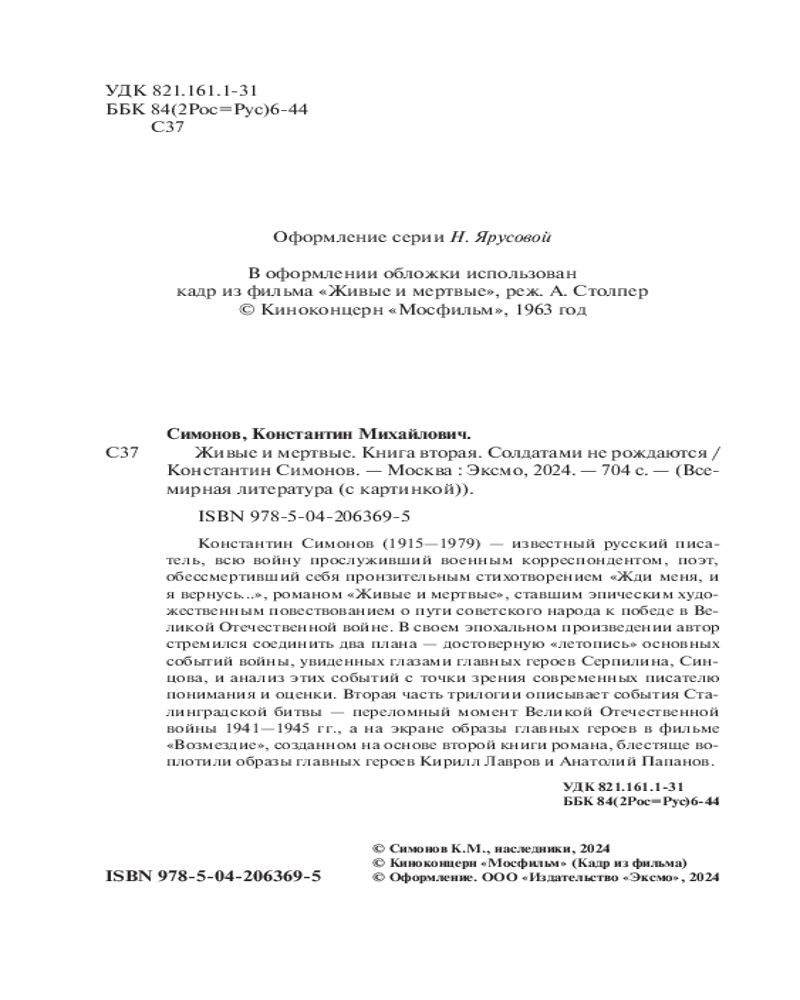 💳 Оплатить за товар можно при получении 🇰🇿 Есть бесплатная доставка по Казахстану от 1 дня 🎁 Копите бонусы с каждой покупки Серия: Всемирная литература (новое оформление) Константин Михайлович Симонов (1915–1979) — известный русский писатель, всю войну прослуживший военным корреспондентом; поэт, обессмертивший себя пронзительным стихотворением «Жди меня, и я вернусь...», романом «Живые и мертвые», ставшим эпическим художественным повествованием о пути советского народа к победе в Великой Отечественной войне. В своем эпохальном произведении автор стремился соединить два плана — достоверную «летопись» основных событий войны, увиденных глазами главных героев Серпилина, Синцова, и анализ этих событий с точки зрения их современного писателю понимания и оценки. |