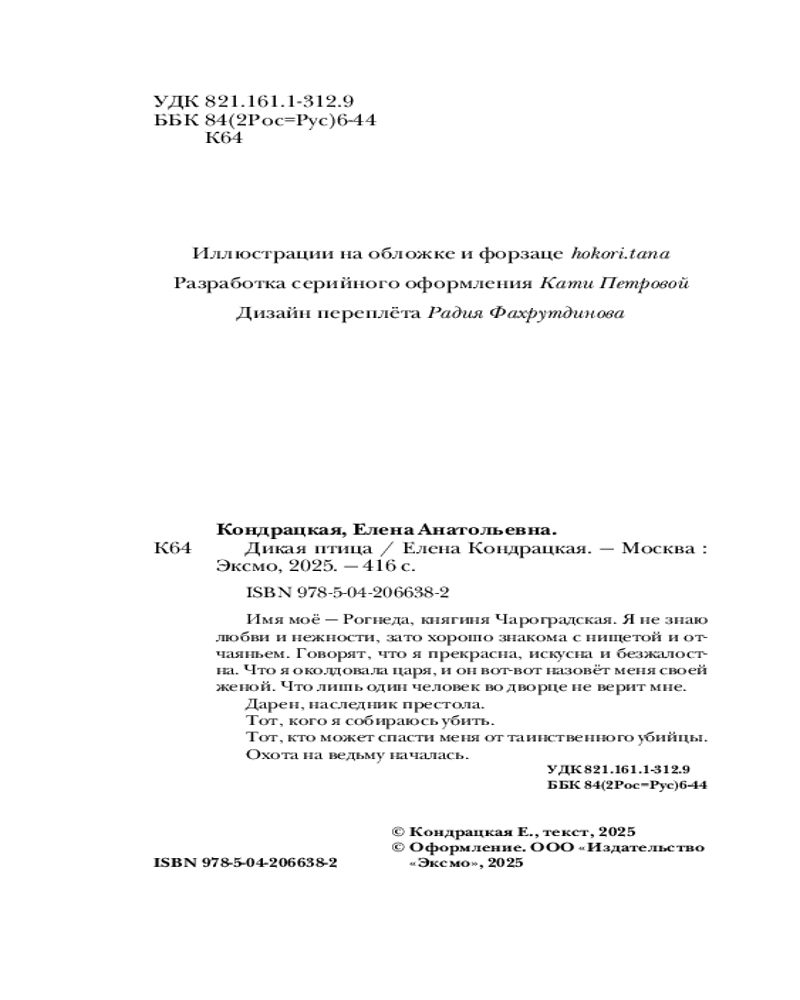 💳 Оплатить за товар можно при получении 🇰🇿 Есть бесплатная доставка по Казахстану от 1 дня 🎁 Копите бонусы с каждой покупки Серия: Young Adult. Книжный бунт. Фантастика Имя моё — Рогнеда, княгиня Чароградская. Я не знаю любви и нежности, зато хорошо знакома с нищетой и отчаяньем. Говорят, что я прекрасна, искусна и безжалостна. Что я околдовала царя, и он вот-вот назовёт меня своей женой. Что лишь один человек во дворце не верит мне. Дарен, наследник престола. Тот, кого я собираюсь убить. Тот, кто может спасти меня от таинственного убийцы. Охота на ведьму началась. |