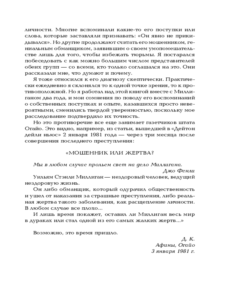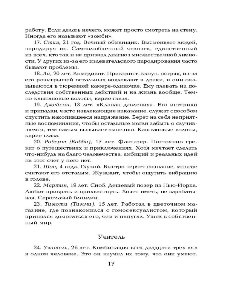 💳 Оплатить за товар можно при получении 🇰🇿 Есть бесплатная доставка по Казахстану от 1 дня 🎁 Копите бонусы с каждой покупки Серия: Жемчужина. Классика тихой роскоши Билли просыпается в тюремной камере. Его обвиняют в изнасиловании и ограблении. Билли потрясен, ведь он ничего этого не делал! Последнее воспоминание — крыша школы, с которой он хотел сброситься. Ему говорят, что с тех пор прошло семь лет. Билли в ужасе. У него опять украли кусок жизни! Его спрашивают: что значит «украли кусок жизни»? И почему «опять»? Выходит, такое случается с ним не впервые? Но Билли не может ответить. Билли уже ушел. Вместо него на зрителей смотрит одна из двадцати четырех личностей. Она здесь, чтобы защитить Билли... |