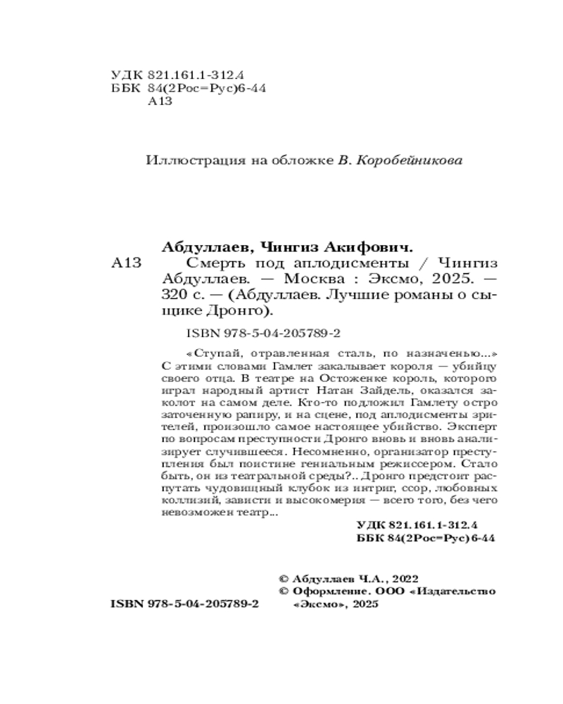 💳 Оплатить за товар можно при получении 🇰🇿 Есть бесплатная доставка по Казахстану от 1 дня 🎁 Копите бонусы с каждой покупки Серия: Абдуллаев. Лучшие романы о сыщике Дронго. Эконом (обложка) В театре на Остоженке король, которого играл народный артист Натан Зайдель, оказался заколот на самом деле. Кто-то подложил Гамлету остро заточенную рапиру, и на сцене, под аплодисменты зрителей, произошло самое настоящее убийство. Эксперт по вопросам преступности Дронго вновь и вновь анализирует случившееся. Несомненно, организатор преступления был поистине гениальным режиссером. Стало быть, он из театральной среды?.. Дронго предстоит распутать чудовищный клубок из интриг, ссор, любовных коллизий, зависти и высокомерия — всего того, без чего невозможен театр... |