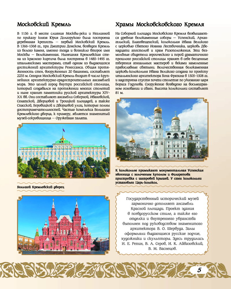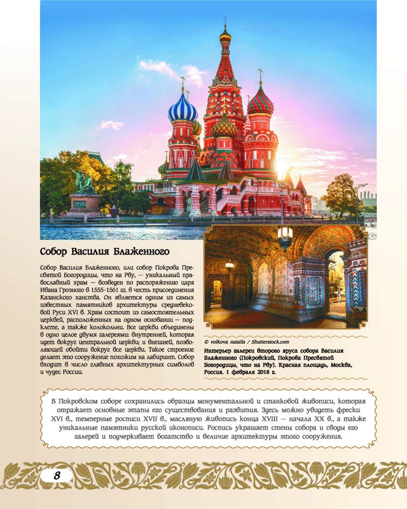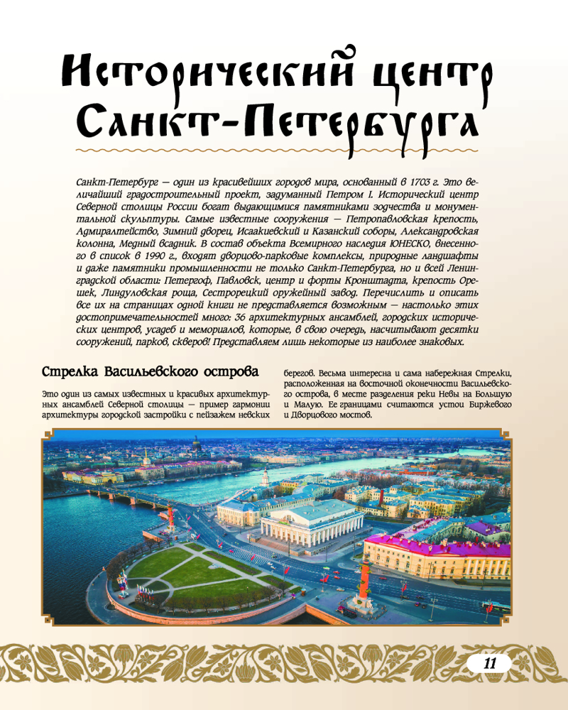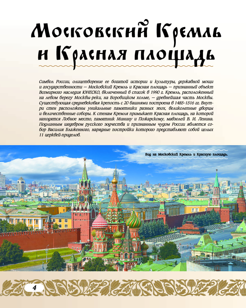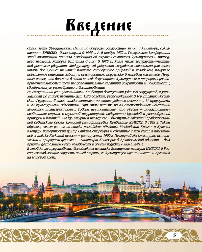 Все они входят в список Всемирного наследия ЮНЕСКО в России. На сегодняшний день этот перечень насчитывает 33 уникальных и самобытных объекта, расположенных на территории нашей страны. В данной книге они представлены во всей их исключительной красоте и многообразии. Это историко-культурные памятники, шедевры архитектуры и искусства, созданные творческим гением отечественных мастеров разных эпох, это научные достижения величайших умов России, а также ее потрясающие природные богатства: заповедные зоны с девственными лесами и бескрайними степями, знаменитые вулканы и острова, обширные водоемы и горные массивы. Все эти природные и культурные ценности стали не только предметом гордости и восхищения жителей нашей страны, но и достоянием всего человечества, тем бесценным и хрупким даром, который мы обязаны хранить и беречь, чтобы передать будущим поколениям. |
