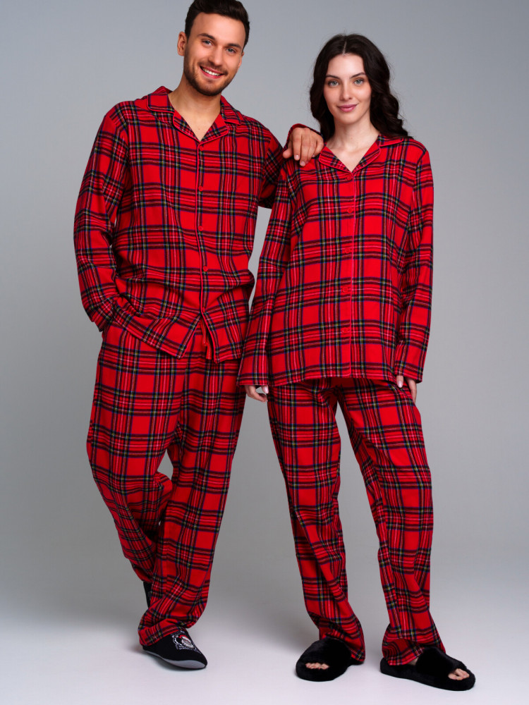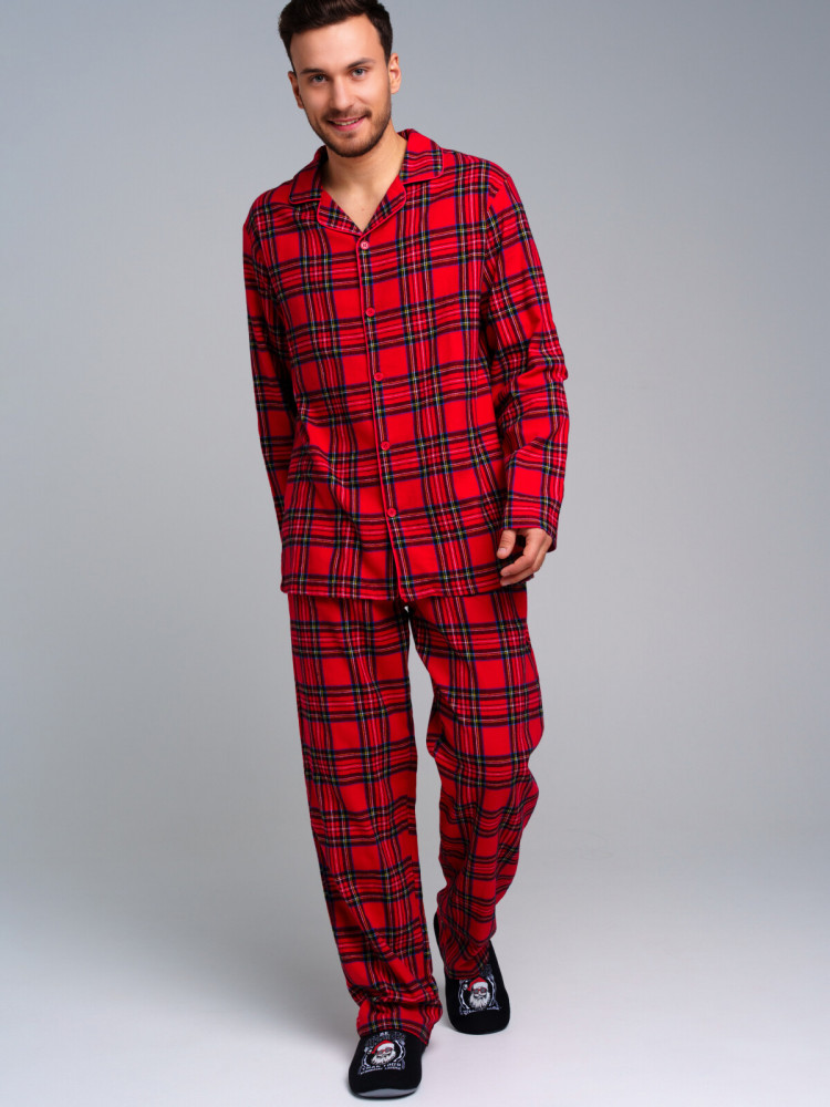Мужская фланелевая пижама. 100% хлопок. Фланель — мягкая, приятная к телу ткань с небольшим начесом. Застежка на пуговицы. Карманы в брюках. Эластичный пояс с тесьмой позволяет легко надевать брюки и утягивать до комфортной посадки. Можно составить family look c детским вариантом пижамы аналогичного дизайна.