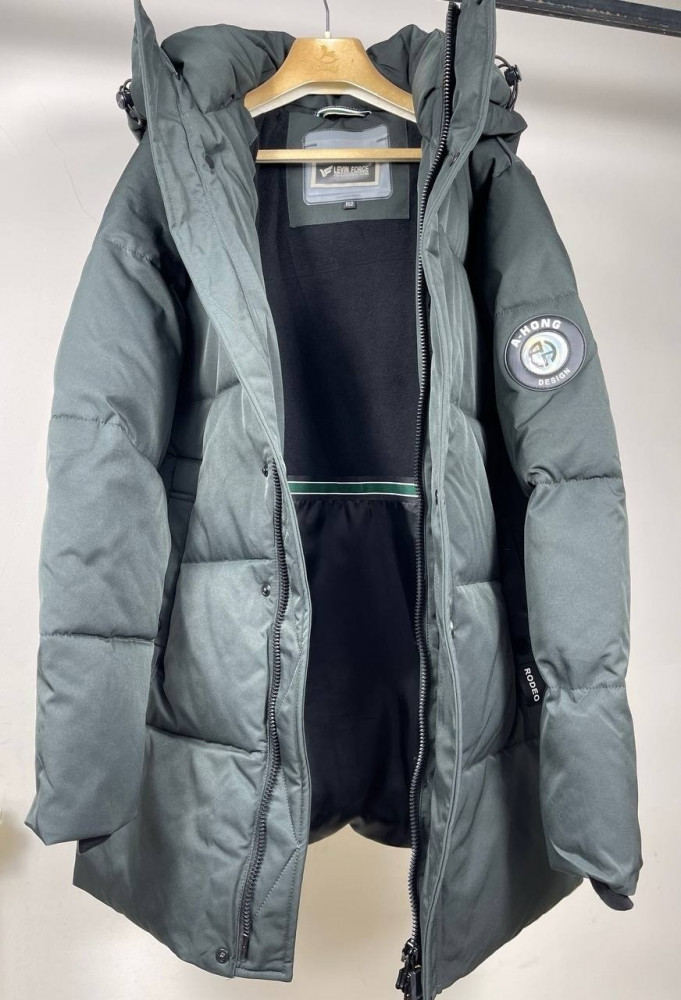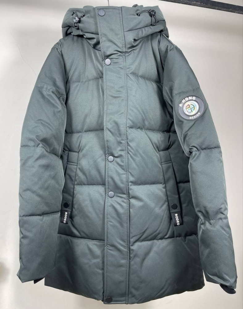 Эта стильная зимняя куртка-пуховик в глубокий темно-зеленом оттенке идеально подходит для холодного сезона. Выполненная из прочного и теплого материала, куртка эффективно защищает от ветра и мороза. Объемный капюшон с регулируемыми утяжками обеспечивает дополнительное утепление, сохраняя тепло и комфорт даже в суровых погодных условиях. Центральная молния скрыта под планкой с кнопками, создавая барьер для холодного воздуха. Карманы на молниях удобны для хранения вещей и согревания рук. Логотип "AHONG Design" на рукаве добавляет куртке стильный акцент, подчеркивая её качество и уникальность.