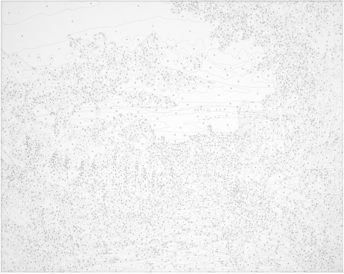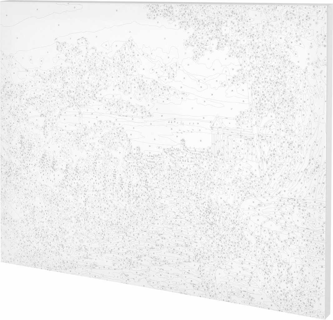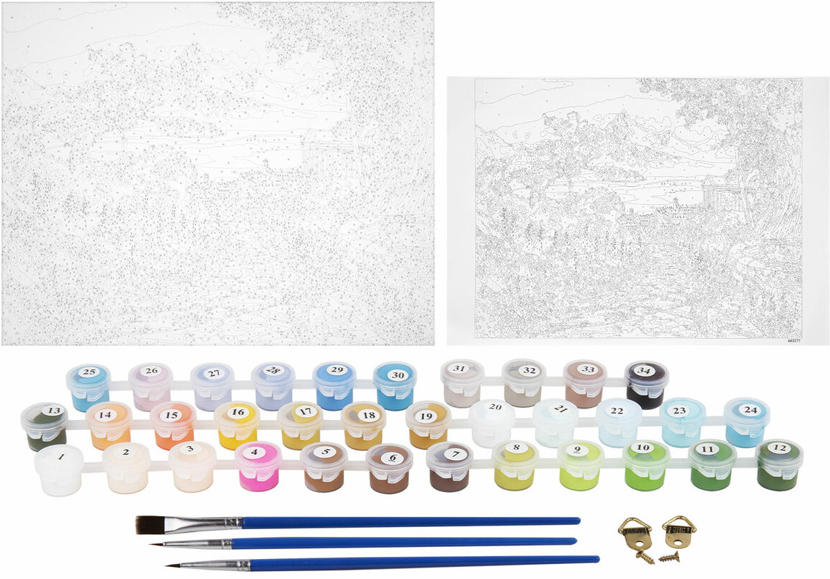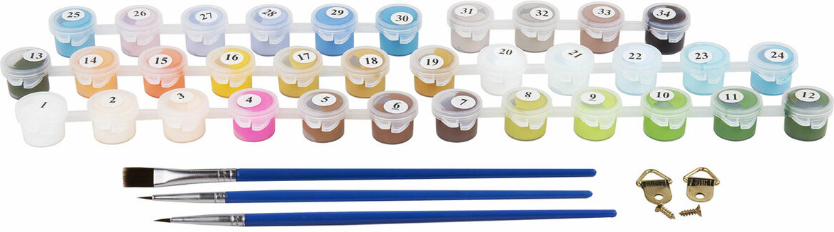 В наборе: 1 хлопковый холст на подрамнике с контуром, 1 лист бумаги для тренировки, набор из 34 акриловых красок объемом 3 мл каждая, 3 синтетические кисти и комплект металлических креплений для подвешивания на стену.