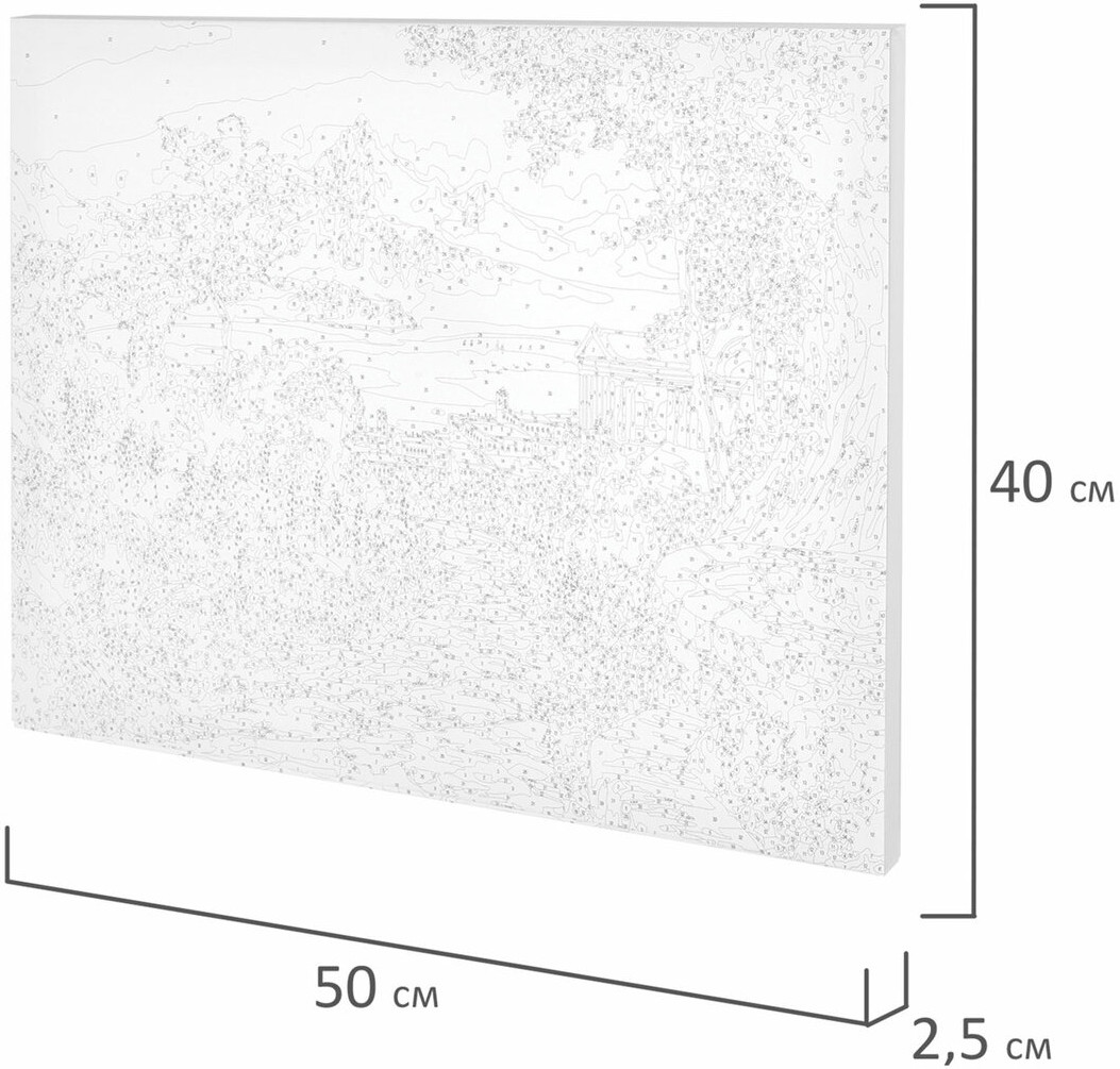 3 синтетические кисти разного размера идеально подойдут для закрашивания элементов различной сложности. Холст из 100% хлопка плотностью 290 г/м² с высококачественной печатью и отличным натяжением. При работе с картиной дополнительно могут понадобиться: емкость с водой для мытья кисти и салфетка для удаления воды с кисти (в комплект не входят). Подходит для потребителей всех возрастов (от 8 до 80 лет). Поставляется в картонной упаковке с ручкой.